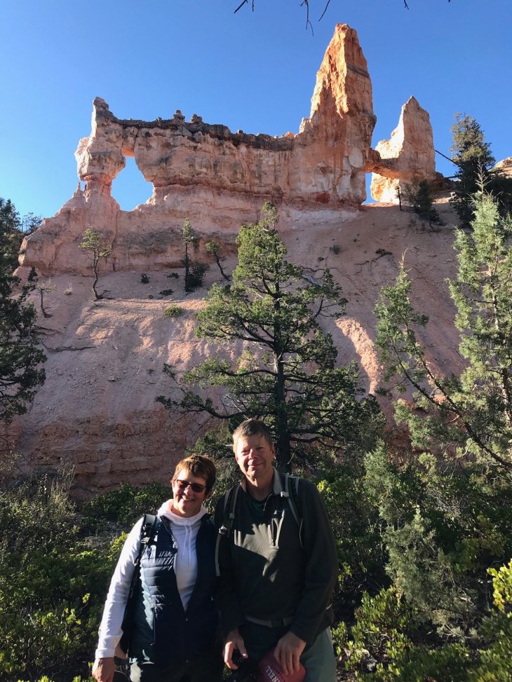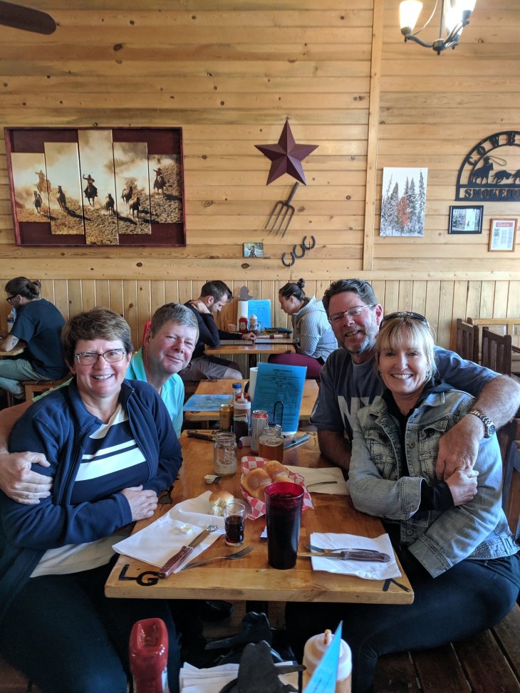 And it was only 30deg F. We then headed back down to the canyon floor for the 9 mi Fairyland Loop. We found the 4.5 hr hike beautiful but strenuous, with multiple ups and downs and 1800ft total elevation which felt like 18,000ft. We’d been hiking moderate to strenuous 5-9 mile hikes for each of 5 days. It’s time for a rest. As Bob says “I’m sick of hiking” (for today). After a drive to Rainbow Point at the end of the park through burned out forests and more canyon vistas, we cleaned up and drove to Panguitch for dinner. Tina’s father recommended the Cowboy Smokehouse which he had visited about 10 years before. Panguitch is a ‘one-horse’ town. The restaurant was quaint, the service was friendly and fun, the food (BBQ) was good though not the wine or the beer. Utah has a way to go in the alcohol quality department. Come on, Mormons, get with the program!!!
