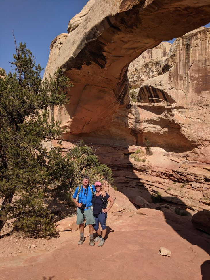 We stopped for Greg to photograph some more and then noticed smoke emanating from our rented Equinox. After determining it was transmission fluid hitting the hot engine, we continued on. We were in the middle of no where and I figured the 2 motorheads (Greg and Bob) knew what was what. It’s a sealed transmission and likely downshifting down the steep hills caused some pressure build up, so we shall see…We drove to and through Capitol Reef National Park, another amazing canyon of geological wonders. We opted for an easier hike, a 2 mi out and back trail to Hickman’s Bridge, a natural bridge formation. Again with the expansive views.