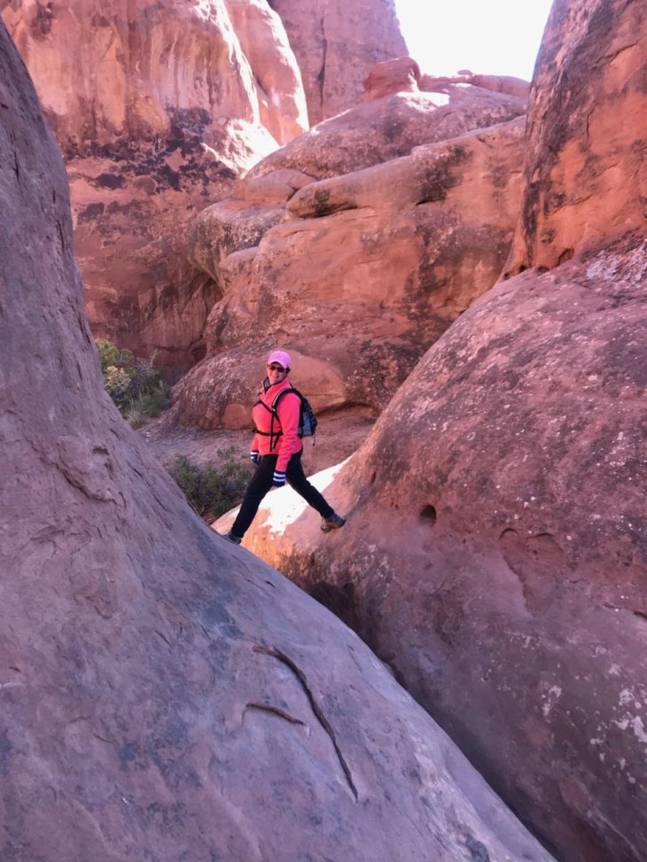 The next morning after a relaxed breakfast (I’m still anxious from the breakfast stampede at Ruby’s in Bryce) we headed back to Arches so Greg could photographically document every arch in the park. The rest of us hiked along for support. It was cool and sunny and only 30deg F but was sure to reach 50deg F by afternoon, perfect hiking weather as far as I’m concerned. We drove straight to the back of the park to hike the Devil’s Garden and Primitive trails, finding 7 arches in this 8 mile hike (Tunnel, Pine Tree, Landscape, Partition, Navajo, Double O, Private). The hike was more scrambling and bouldering than I’ve ever done and I loved it! We found ourselves wandering between red stoned walls, or fins, of rock and climbing up narrow ridges of sandstone domes to get from arch to arch. There was one narrow 6 foot x 6 inch very steep section where both Tina and I staved off panic attacks (no exaggeration) but we made it through. And then 2 old guys annoyingly ‘danced’ through after us without a thought. Tina and I were proud we did it anyway.