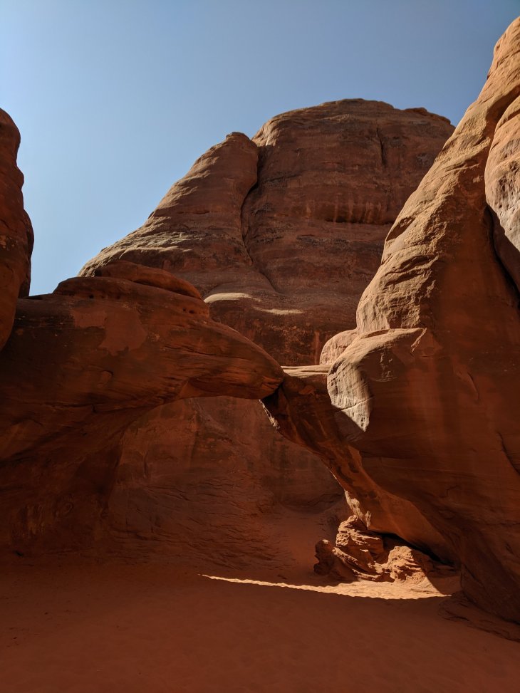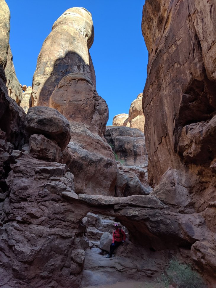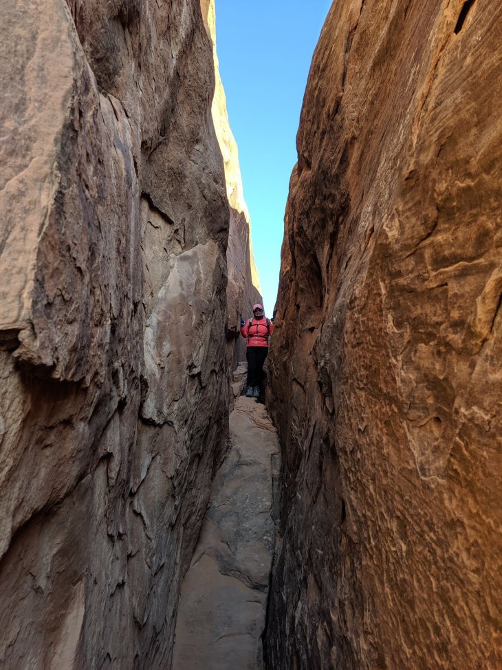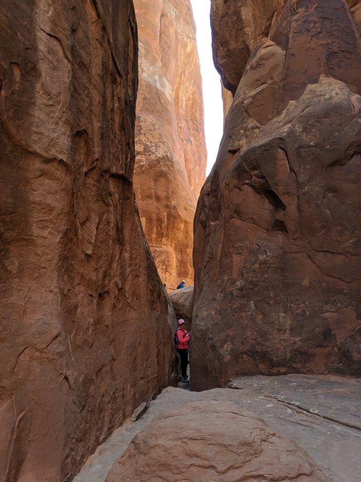 On Friday we headed back into Arches to hike the infamous Fiery Furnace. A permit is required to hike amongst the red stoned fins and canyons and only 75 hikers are allowed each day. We were lucky to get a permit but I was nervous for the hike. Think of the Fiery Furnace as a corn maze: there is no map (well, you could download one from Alltrails), there are few trail markers, and there are many dead ends. And there are a lot of opportunities for scrambling and bouldering and squeezing yourself through narrow passages. And possibly encountering rattle snakes and spiders. It was a blast and one of the best hikes ever! In fact, more often than not, Tina and I found ourselves leading the hike and trying to find the best path through. We did use the Alltrails app occasionally for guidance when all else failed. It took us 2.5 hours to find our way out, about 2.2 miles total. There was no rush to finish, however, because exploring the dead ends was kinda fun too. There were no snakes or spiders to be found possibly because it was too cold, thank heaven.