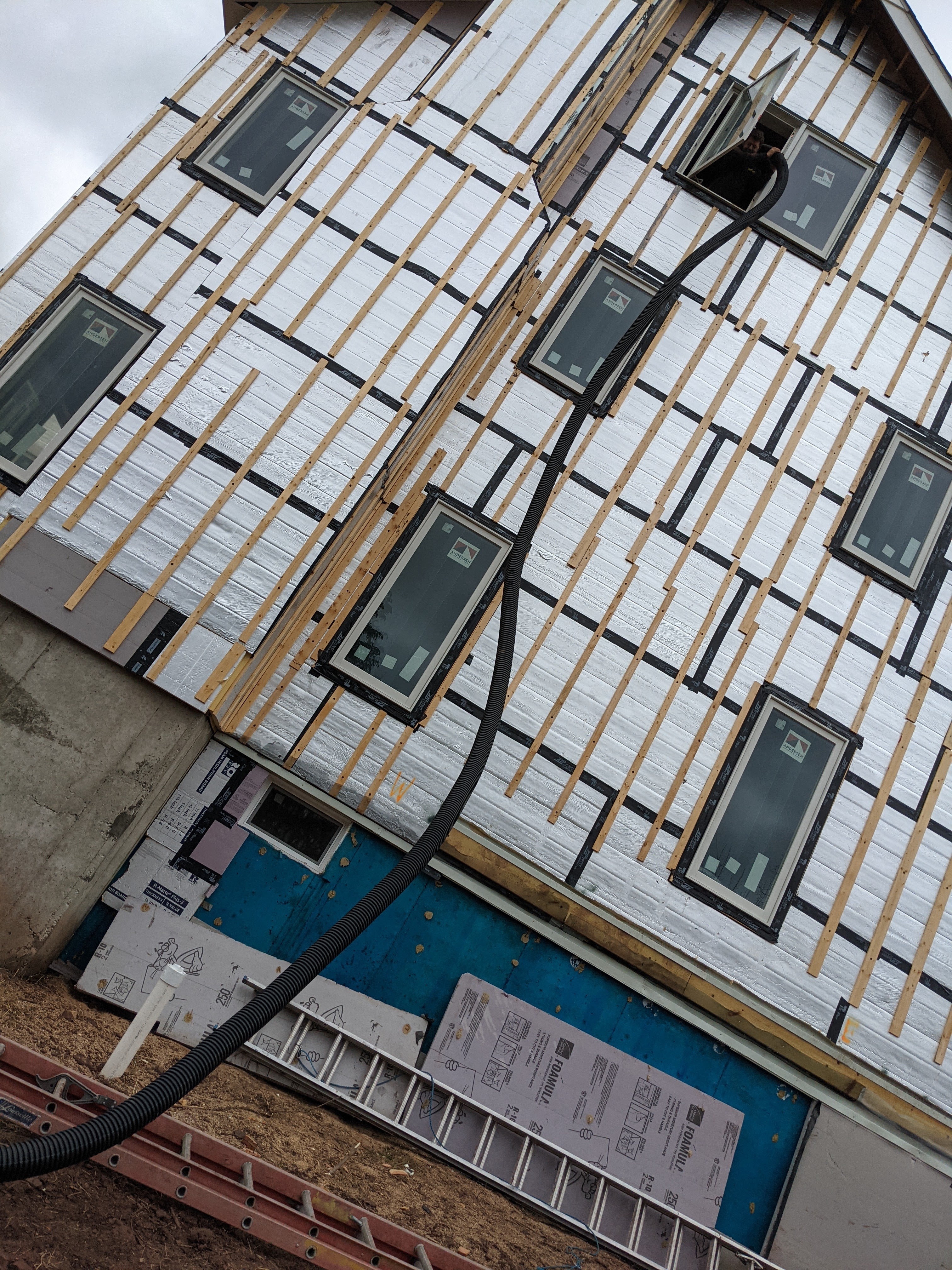 Bonilla Bros. started work on the Hardie-board fibreglass/cement siding with PVC trimwork. This combination should make for a relatively maintenance-free exterior. Of course, the contractor was unfamiliar with the exterior insulation/strapping work that we had done but with Greg’s assistance and some advice from the Hardie company reps it was all figured out. They did an amazing, meticulous job of flashing and trimwork and the house is slowly looking finished on the exterior (save for a few areas where there is some future work to be done, e.g. continuation of the porch roof and decks). Tomas and company at Bonilla were eager to please and consulted Greg a lot which is alternately reassuring and yet bothersome but in the end will make for a job well done for years to come.