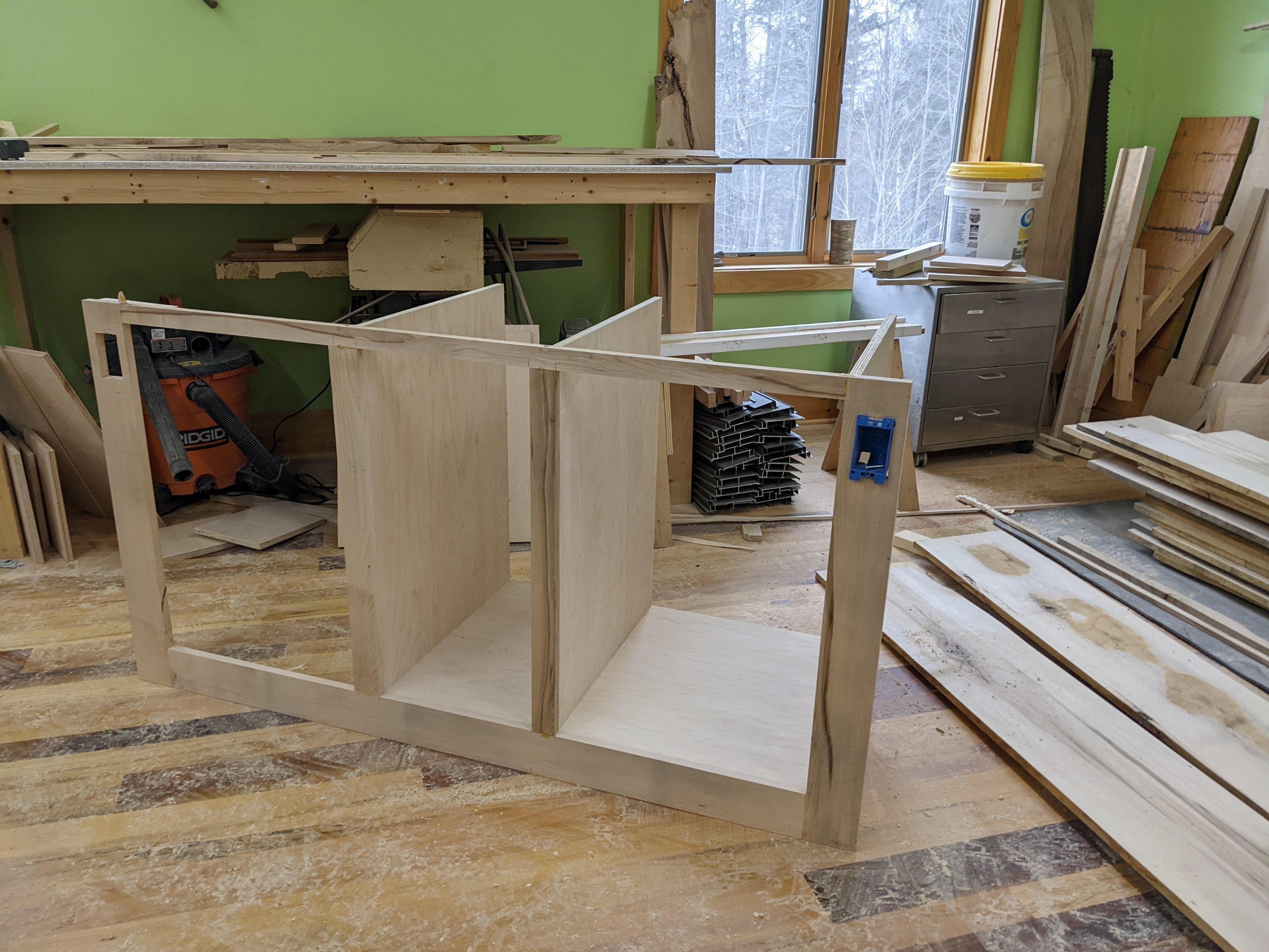 We returned home while Dan and Anna continued to paint: 2 coats of ceiling paint in every room and wall paint in multiple rooms. Meanwhile, Greg began kitchen cabinet construction. We’ve had many maple trees cut and sawn from our property and stored in our barn, about 10,000 board feet I’d guess. I’m told it’s “money in the bank” by my lumberjack north country neighbors although I’d rather have gold or bitcoin. Greg built a wood kiln within the barn to dry lumber ingeniously using polyfoam insulation, dehumidifiers and (carefully monitored) heat lamps. With the maple appropriately kiln dried in advance, he began his cabinetmaking.