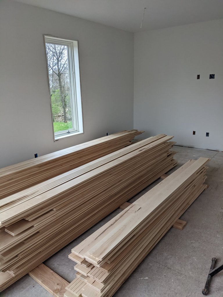 Anna had researched wood flooring options in PA but in the end they decided on brown maple hardwood flooring milled from our friend Tom Devlin’s Northern Hardwoods lumber supply in Lake George. We met Tom by chance when we were building our current abode back in 2006. We worked with him to mill the lumber harvested from our property for our own floors and cabinets. Coincidentally, he has a lake cabin across the bay from us. Greg arranged for Northern Hardwoods to source and mill D&A’s flooring. When it was ready, Dan and Anna rented a huge Penske flatbed, drove it up to Lake George, where Northern Hardwoods loaded it. Then they drove back down and unloaded it by hand, all 4 tons of it and within 24 hours so as to return the truck on time.