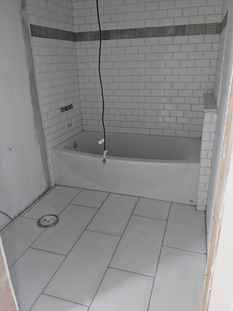 Before we left Greg prepped the remaining first floor and second floor rooms for Dan and Anna to finish on their own. The front door was also installed, replacing the ugly plywood which served to close the opening all winter. I spent some time feathering joint compound seams in the bathroom, sealing seams on shower Hardie boards, and grouted the first bathroom walls and floor. Thus another weekend was completed and we headed out for a little vacation.
