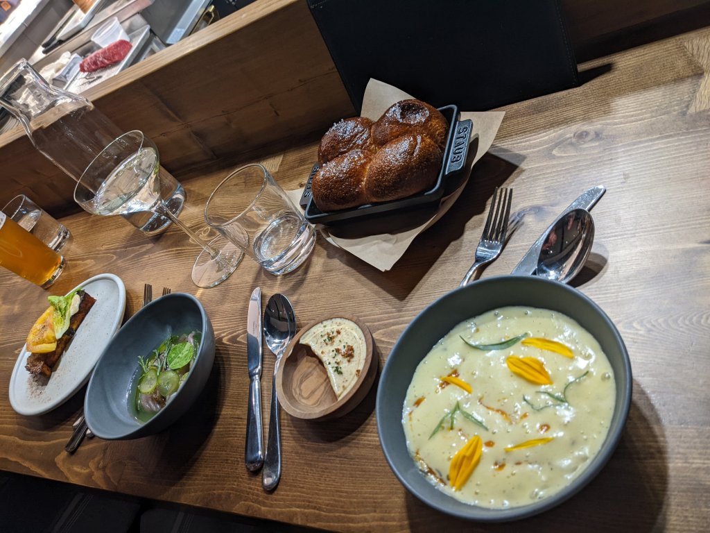 The following morning I caught up with a good friend, Karen, who was nearby visiting her mom, then we headed down the Pot Parkway to Portland. Our hotel, the Inn at St. John, was somewhat dated but cheap compared to the newer hotels in town charging NYC prices. In Portland? Weird, although Portland was much larger than expected. It is a working seaport with an edgy vibe. We walked the entire length of the city to visit a few breweries and check out the wharfs and the cobblestone streets full of bars, boutiques, and no surprise, head-shops and dispensaries. Remarkably, I snagged reservations at Twelve for a late dinner. Twelve is listed in the NYT as one of the top 50 up and coming restaurants in the country. We were seated at the Chef’s table overlooking the kitchen. It was fascinating to watch them cook with exquisite perfection and then have them serve us immediately after. Farro saboyon, mackerel crudo, monkfish with trout roe, NY strip steak! The food was divine. Thankfully we saved money on the hotel to pay for this treat.https://www.nytimes.com/interactive/2022/dining/best-restaurants-list-america.html