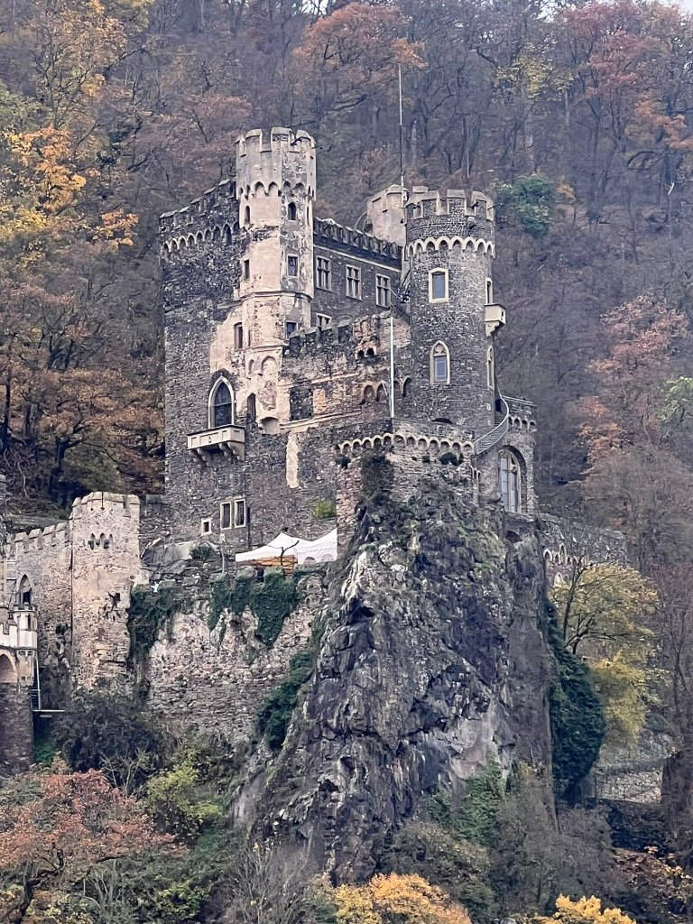 We were now sailing down the Middle Rhine and spent the next morning cruising past castles. It was quite chilly but more hot chocolate (with Bailey’s) kept us warm. We sailed past the local landmark, the Lorelei, a cliff jutting into the Rhine. Here the legend tells of the maiden Lorelei who threw herself into the river because of a faithless lover, later becoming a siren who lures sailors to their death. Our captain successfully steered by. Afterwards, we stopped in Braubach to visit the Marksburg castle.