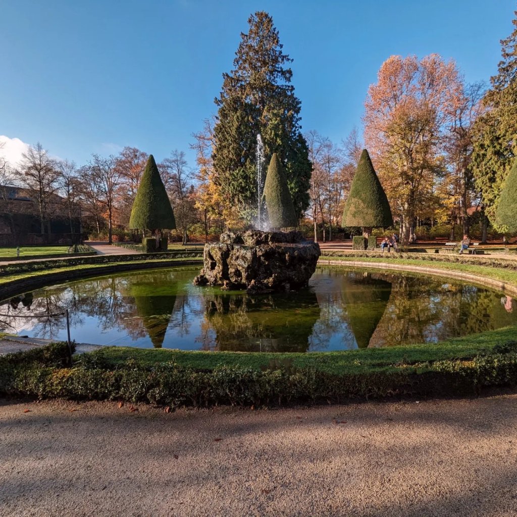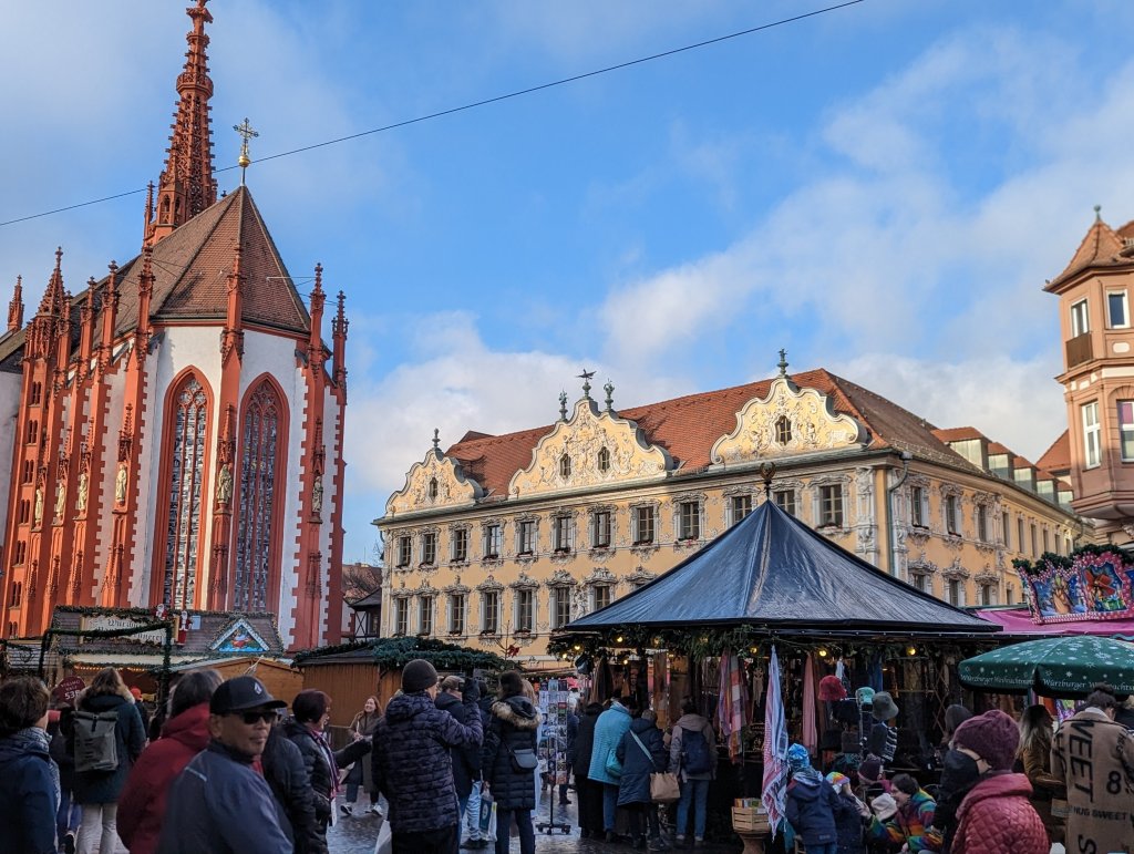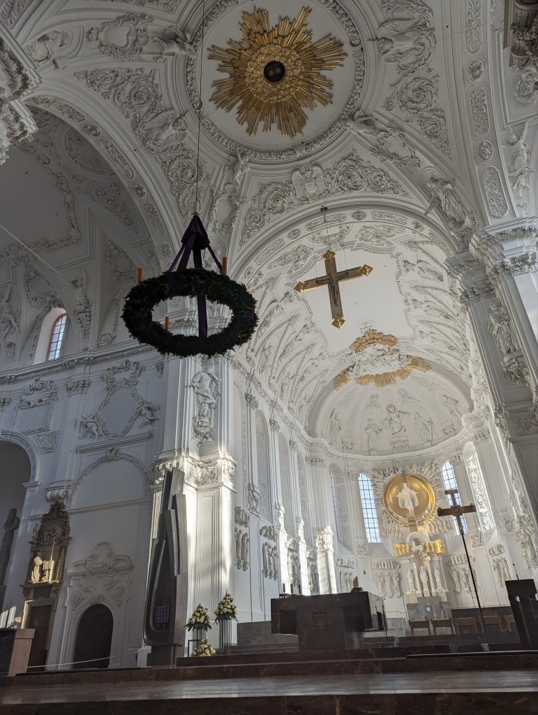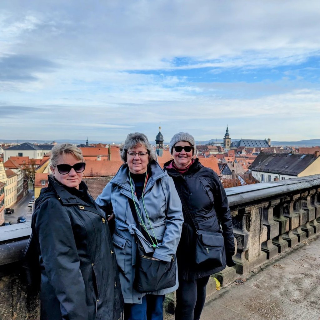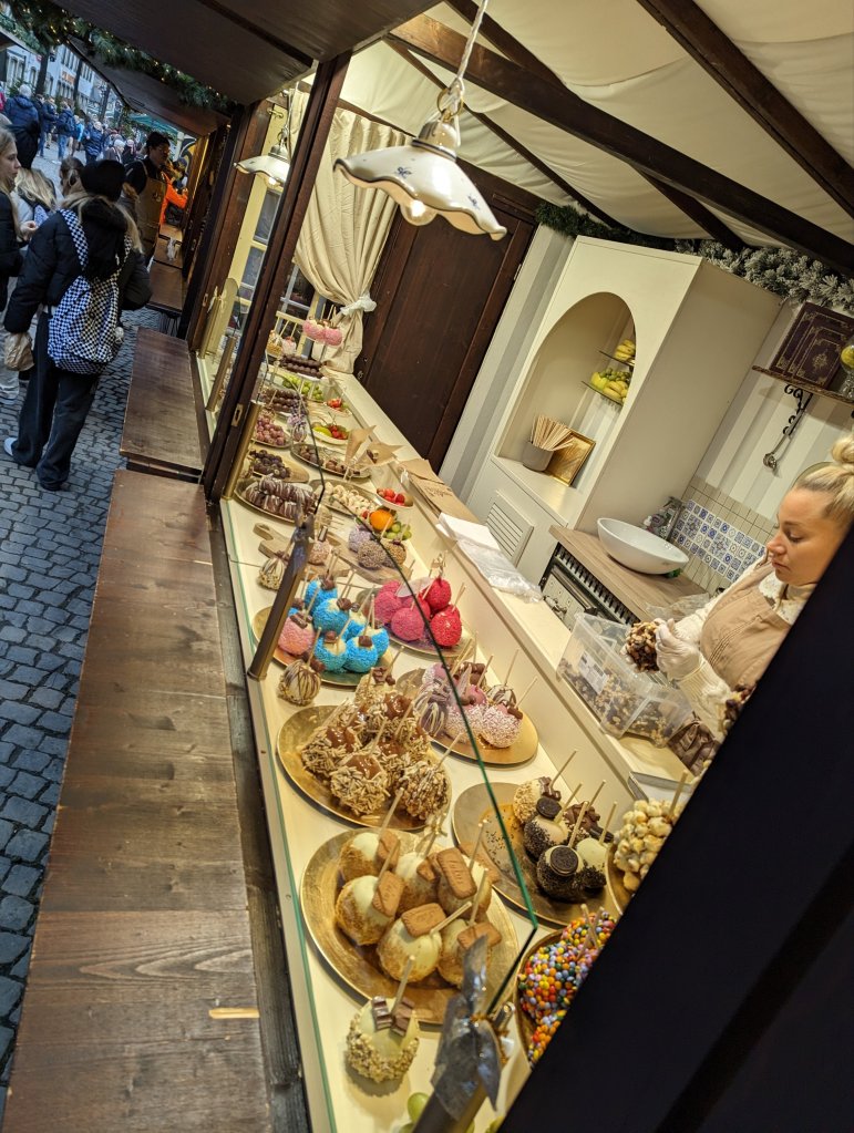 Wurzburg was our final ‘berg’ stop. As we sailed into the area we were welcomed by the site of wineries alongside the river and a huge castle on the hill. We started the morning at the beautiful Bishop’s Residence Palace. This outstanding palace had an amazing ceiling frescoed by Tiepolo over the main stairway celebrating the 4 seasons but also a room with glass ceiling decoration that puts Chihuly to shame. We viewed restored golden rooms, ornate wood flooring, and rooms with mirrored walls that were almost too beautiful. Most of this was rebuilt after significant WWII bombing but remarkably the original ceiling fresco and the glass decoration in the armament hall were original. An American, Major John Davis Skilton, another ‘Monuments Man’ was responsible for it’s reconstruction. Unfortunately, we didn’t have too much time to visit the beautiful gardens. Despite the season and lack of flowers it was a sunny day and the fountains and manicured bushes were pleasant to look at. We headed over to the town and visited a few of the churches: St. Killian’s (yes, named after an Irish missionary) and the Mariankapelle. St. Killian’s had probably the most pleasing mix of very old and newly incorporated contemporary art in its very white interior. We enjoy exploring the corners of old churches and buildings and here we found crypts and basement chapels with contemporary art and sculptures. Later we visited the Mariankapelle, a rather large chapel. Apparently churches that were built over destroyed synagogues are often dedicated to Mary. Not sure this is fair atonement for their pogrom? We enjoyed lunch at the Rathskellar in the town hall with our new cruise friend, Sue, and tasted the local white wine, Silvaner. Wurzburg had a large and busy Christmas market that my sisters and Sue shopped but instead Greg and I walked across the bridge and up the hill to check out the huge Marianburg fortress on the hill overlooking the river. We explored the castle grounds and got lost trying to make it out of the walled fortress, hoping to walk back through the vineyards on the hill. We did eventually make it back to the ship by retracing our steps and crossing the very busy footbridge crowded with oenophiles enjoying the local wine. After another amazing dinner we enjoyed a glass blowing demonstration by an artisan who was more rock ‘n roller than glass blower.