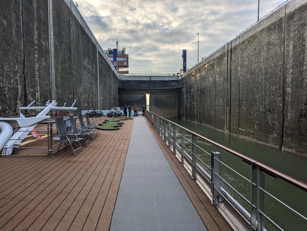 After Nuremberg, the ship entered the Danube-Main-Rhine canal, aka the Europa Canal. This connecting canal from the Main River to the Danube connects the North Sea and Atlantic Ocean to the Black Sea. Originally envisioned by Charlemagne in 793, construction of an actual navigable waterway was finally completed in 1992. That’s a long time in the making and a lot of digging! It has become apparent that the ships were built to accommodate this narrow canal and its many locks, building as tightly as possible often with only 6 inch clearance on either side of the boat.