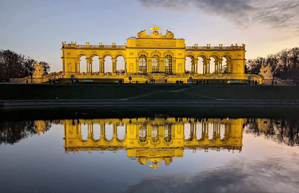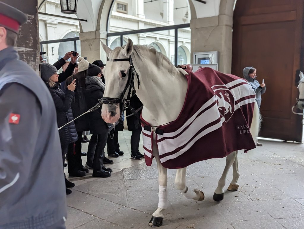 We sailed most of the next day towards Vienna, catching up on jetlag and attending the required safety talks and enjoying afternoon tea. Did I mention that we had unlimited drinks? The lounge became our favorite hangout place (usually nearest to the bar). We arrived in Vienna that evening. Greg and I enjoyed a Mozart and Strauss concert in a small venue at the Music Hall. The musicians were very good but also provided some levity in the latter half of the concert. Terry and Christine wandered on their own around the Vienna Christmas markets. Terry, having accidentally knocked her Christmas tree down last year, was on the hunt to replenish her ornament inventory and this was the trip to do just that. We met up for late night drinks. Next day we had a walking tour of Vienna; how fun for the tour guide to escort about 12 guests onto and hopefully off altogether at the same subway stop. Greg and I had been here twice before for conferences and Vienna had not changed. It is still glittery and shining, a golden version of the Emerald City with wide boulevards and baroque architecture. Our guide, as they all were, was informative and charming. We visited some new places for us including the Hrdlicka Sculpture near the Opera House and Albertina Hall and the Judenplatz Holocaust Memorial with it’s evocative books representing 65,000 murdered Jews and their stories that will never be read. And didn’t we see the Lippizaners as they left the stables? We were so close we could touch them. On our free time we visited St. Stephen’s Cathedral (yes, another St. Stephen’s), the Christmas Markets and also had treats and coffee at Cafe Hawelka (outstanding strudel, sachertorte – meh). We took the subway back to the ship and then headed out on buses for an excursion to Schonbrunn, the Hapsburg Palace. This was a revisit for us yet the palace and grounds were still beautiful. We arrived in the evening for the tour and afterwards got some amazing shots at dusk of the Gloriette. We had watched “The Empress”, a German series on the Hapsburg Empress Elizabeth, aka, Sisi, before our trip. After marrying Emperor Franz Joseph, Sisi became disillusioned with palace life, ala Princess Diana, and like Diana, is remembered everywhere throughout the former Empire (especially in Hungary) with buildings, parks, monuments, fountains, and museums dedicated in her name. Back to the ship for what was becoming routine: an outstanding sit down dinner created by the ship’s chef, Sasha, and served by our merry complement of Portugese wait staff, David, Miguel, George, and later, Daniela. Whether the regional cuisine or the chef’s specials, the food served on the boat was too good, all the time. Today: Wiener Schnitzel! After dinner (with drinks, of course) there was a lecture on Austrian history.