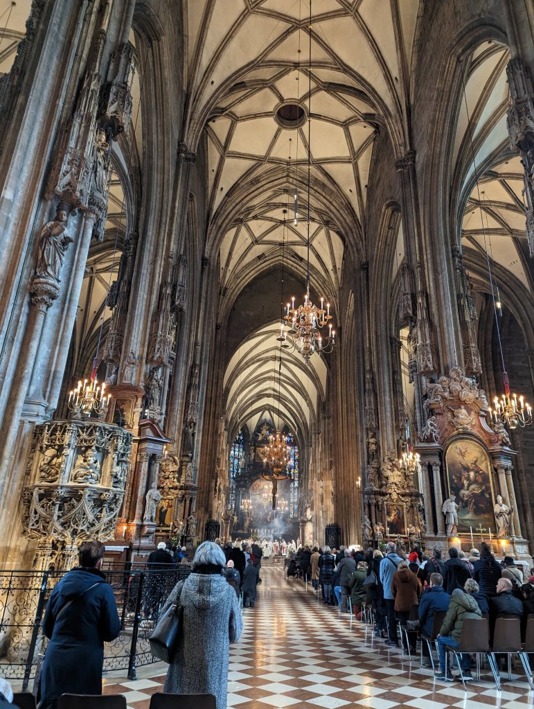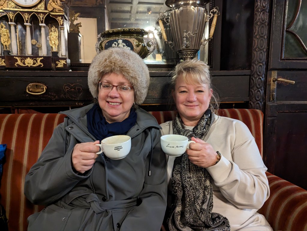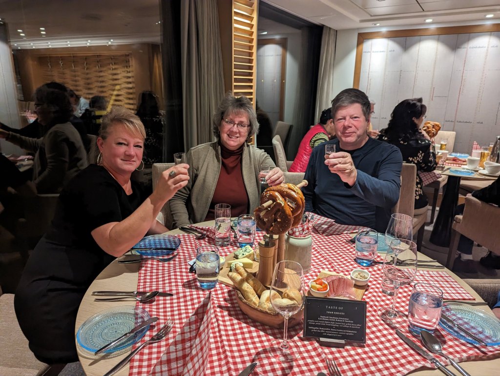 The next morning we awoke to castles as we cruised down the Danube in the Wachau Valley. We enjoyed hot cocoa on the Aquavit terrace on the bow deck before arriving at Melk to visit the Benedictine Abbey. Greg and I had been here before. In 1991 we took a 2 week vacation, driving zig zag across Switzerland, Germany, and Austria (and maybe Lichtenstein?) from Zurich to Vienna and back. Melk was our first exposure to the grand, baroque, golden churches of Germany and Austria, built to the ‘glorification of God’. Here we are 32 years later and now there’s a park outside the Abbey and a restaurant and a gift shop. No photos were allowed inside (“please visit the gift shop”) but we have photos (on film, of course) from 32 years ago when you could take them. (I did sneak a digital shot on my phone this day.) It’s still beautiful and the wood paneled library is amazing. Seems smaller than I remember, though, like my elementary school. That night we enjoyed trivia night hosted by our Program Director Kane Davies who made the trip extra special with his humor and stories. Kane was basically the baby sitter to 150 geriatric guests (average age: about 70, ranging from 40 to 85) and performed his job with panache and patience, and with a lovely British accent to boot!