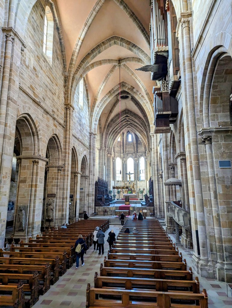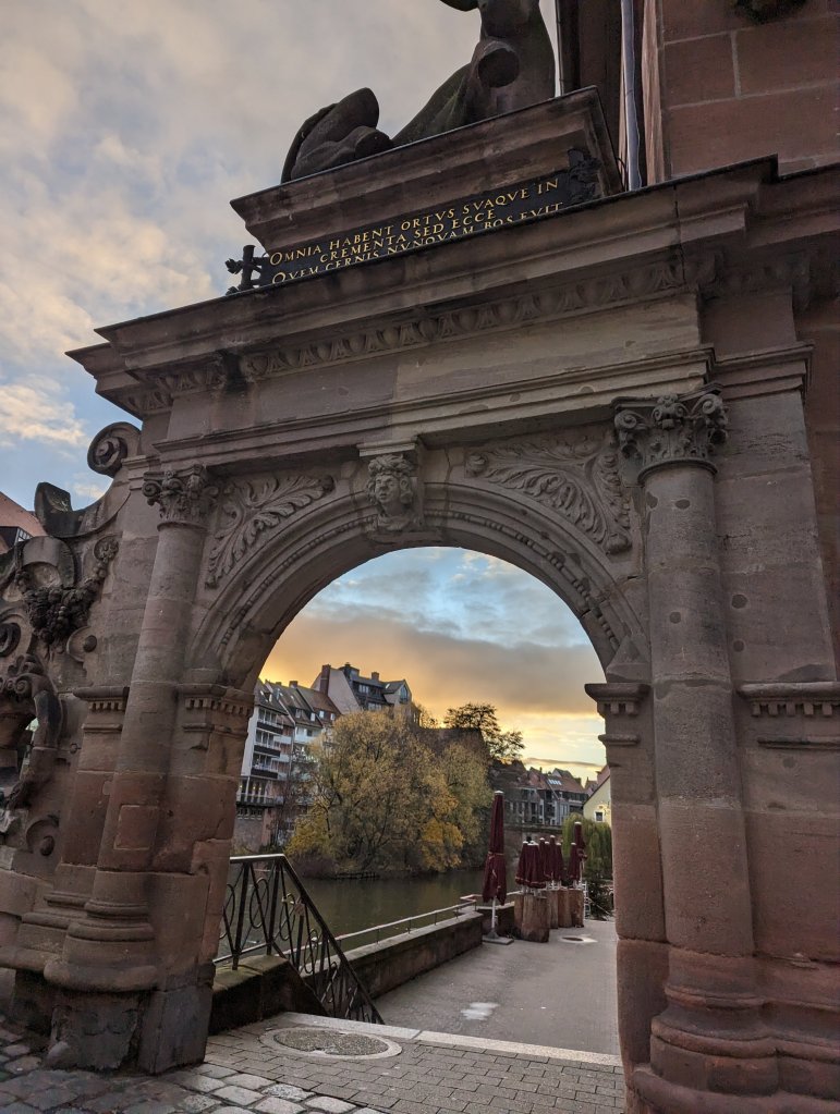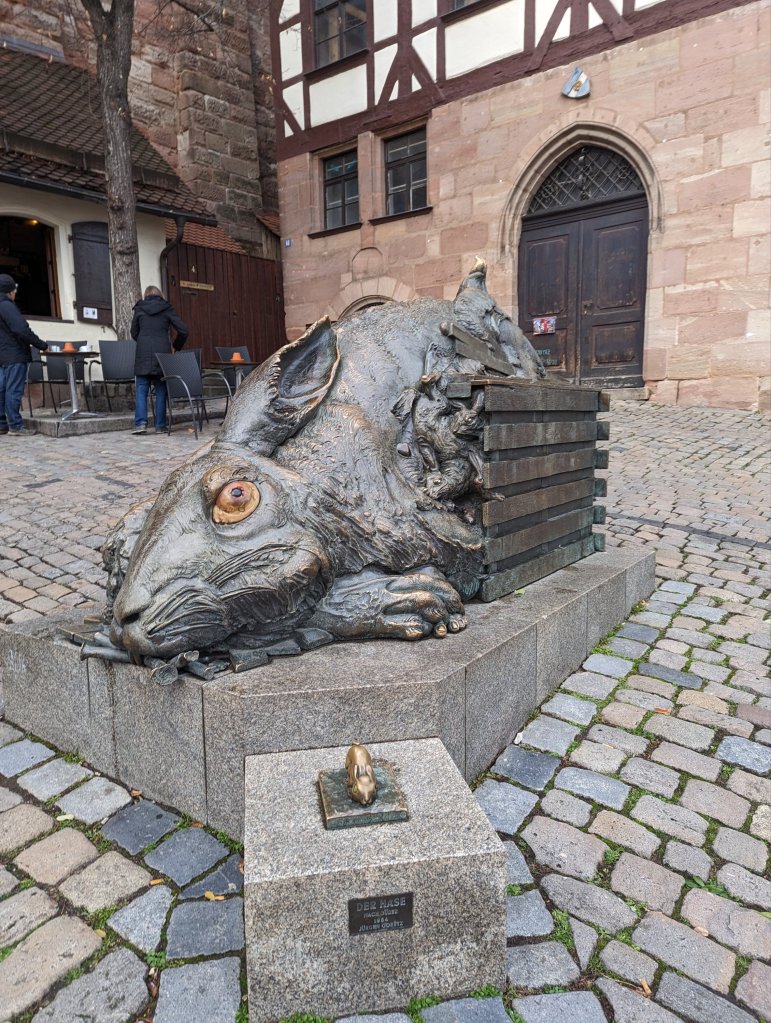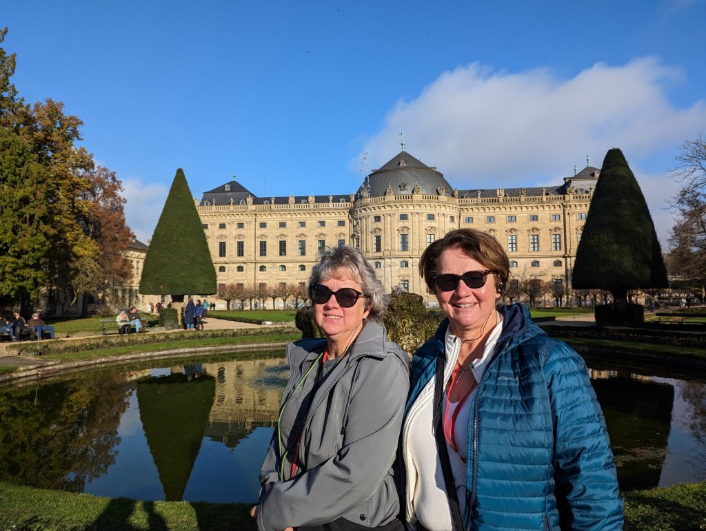 New day, new ‘berg’: Nuremberg. This fairly large city was rebuilt after significant WWII bombing although many of the old city walls and watch towers are original. Here the Nuremberg laws revoking citizenship for Jews were announced and Hitler’s annual rallies were held at the parade grounds. Yet the city was chosen for the Nuremberg trials since it had a government building still standing after all the bombing with attached prisons for holding war criminals in close proximity. Laws prohibiting the Heil salute carry fines up to 4,000 euro which anyone can report. Our tour guide gave a very emotional thank you to those on our tour, all from Allied nations (mostly US but some UK and Australian tourists), as the US occupied this quadrant of Germany after the war. His gratitude for the US ‘saving’ Germany after WWII was evident and well received. I didn’t expect the emotions that were going to be shared on this trip! We toured beer caves, massive caverns originally intended for storing beer that were used to store art works throughout the war (think ‘Monuments Men’) and also for harboring citizens during bombing raids. Later we toured St. Lorenz cathedral, formerly Catholic, now Lutheran (of course, not as simple a transition as all that!), and also walked the bridges and shopped the markets amongst the restored half timbered houses and Gothic churches in the Old Town. Renaissance painter Albrecht Durer was born here and a satirical sculpture of his masterpiece Feldhase (the Young Hare) is located in the restored old town square. We celebrated Thanksgiving back on the ship with turkey and all the trimmings, although the ‘stuffing’ was some kind of weird sliced bread. Later on in the lounge we enjoyed local musicians playing Franconian music (Franconia being the region of Germany we are now traveling in-do not confuse it with Bavaria to these Germans!)