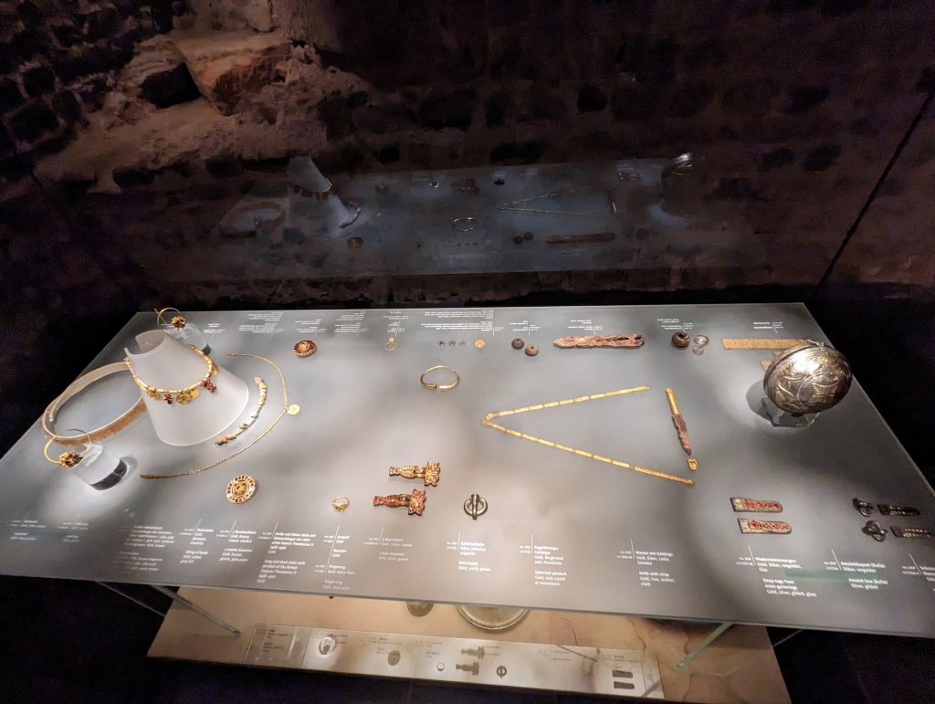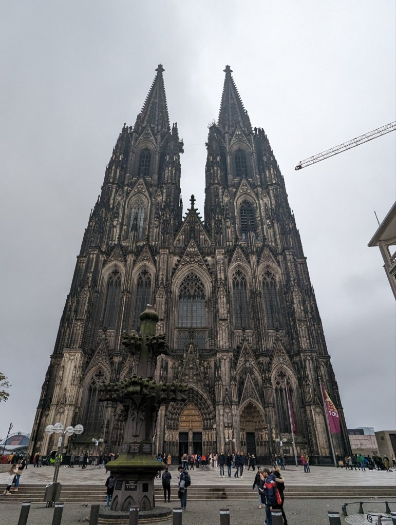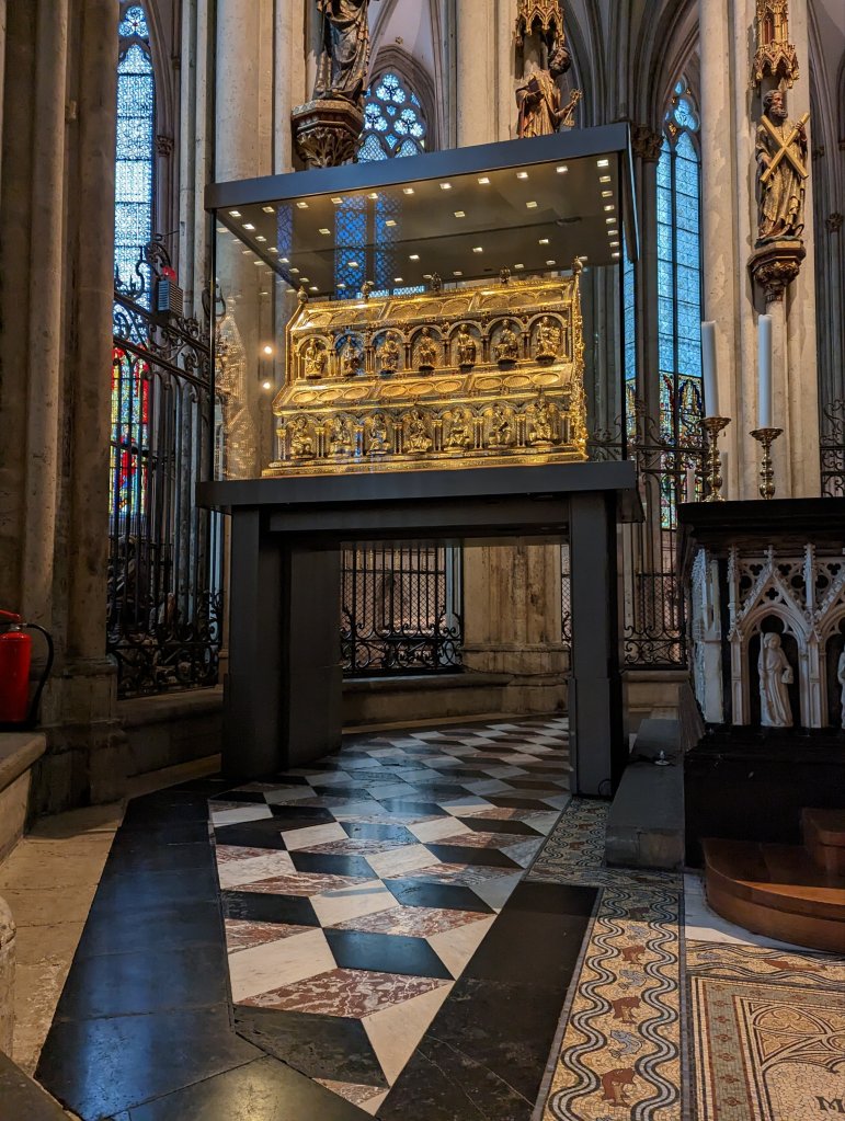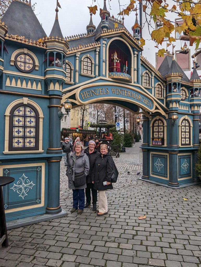 Overnight we moved onto Cologne passing under the Hohenzollerbrucke bridge, heavily encrusted with ‘love padlocks’. Cologne became one of our favorite stops although we said that everywhere we went. The gothic Cologne Cathedral, the Dom, was magnificent. The Christmas markets had beautifully decorated stalls and were very busy and there was a skating rink built in the center of the bustle. We had a nice walking tour in the morning and then had lunch (sausages and never ending pours of Kolsch) in a 18th century tavern. Afterwards Greg and I split off while Christine and Terry hit up the market stalls. Greg and I stumbled onto a prayer service in a local church. A group of nuns with beautiful soprano voices sang in an acoustically perfect setting. It was unexpectedly heavenly. We then meandered back towards the cathedral and considered taking the tour of the towers, a 500 step climb, but decided against it on this cloudy day and visited the museum inside the church. This museum was updated and the displays were outstanding: vestments and altar cloths with intricate gold thread embroidery, jewel encrusted chalices and Bishop’s staffs and rings. There we ran into Christine and Terry also in the museum as they had abandoned shopping to climb the towers and then come to see the treasures. In the lower level the museum displayed more historical treasures: unearthed graves of a woman and boy from the first church built on the site and in another room, the wood and metal sarcophagus which originally carried the relics of the Magi, the Three Kings who visited Jesus in the manger. The Cathedral’s fame and wealth was built on the ownerships of these relics, Frederick Barbarossa aka ‘Redbeard’ having stolen them from Milan in the 12th century. The Cathedral’s construction was started in the 13th century, the relics in hand and with worshippers and tourists visiting the city and pouring money into the coffers. It took nearly 700 years to finish construction of the Cathedral although the relics are now housed in a gold, silver, and jewel-covered reliquary on display behind the main altar. FYI, it is free to visit the cathedral and the reliquary, as most Catholic churches in Europe and the US are. We again left Christine and Terry, who returned to shop the markets, and Greg and I considered walking back to the ship. On the way we stumbled into a group from the ship led by Kane, the Program Director, who was leading them to an optional excursion we thought we were closed out of: The Top of Cologne tour. Kane invited us to go along, as 2 others had just dropped out, and wasn’t it the best experience ever? This tour was led by a resident building restoration expert. She took us up the construction elevator and led us up, down, and around the outside of the upper exterior of the cathedral, where they are restoring gargoyles and flying buttresses and replacing lead roof sheathing or gutters or window casements. We entered the interior of the cathedral through tunnels in the walls, far above the main level and up close to some of the stained glass windows. We walked past the huge organ, suspended from the ceiling to conserve space. We climbed ladders and circular stairs to visit attics and ‘secret’ storage rooms and see the iron metal roof supports that were installed in the 1800’s near to when the cathedral was completed. We visited the center tower and had an outstanding view of Cologne from up high. I was enthralled the whole time and was mostly able to control my fear of heights. I had to, this was so amazing to do and was certainly a highlight of the trip. Unfortunately, I cannot share photos online as a prerequisite of the tour. I can’t express how COOL it was. Luckily the Cathedral did not suffer too much from Allied bombing, although the lead roof did melt. The iron supports underneath kept the cathedral from damage. And now we get to visit in awe. Later that night at dinner we celebrated Christine’s birthday on the ship, coaxing other tables to join in singing to her. She turned 29 again!