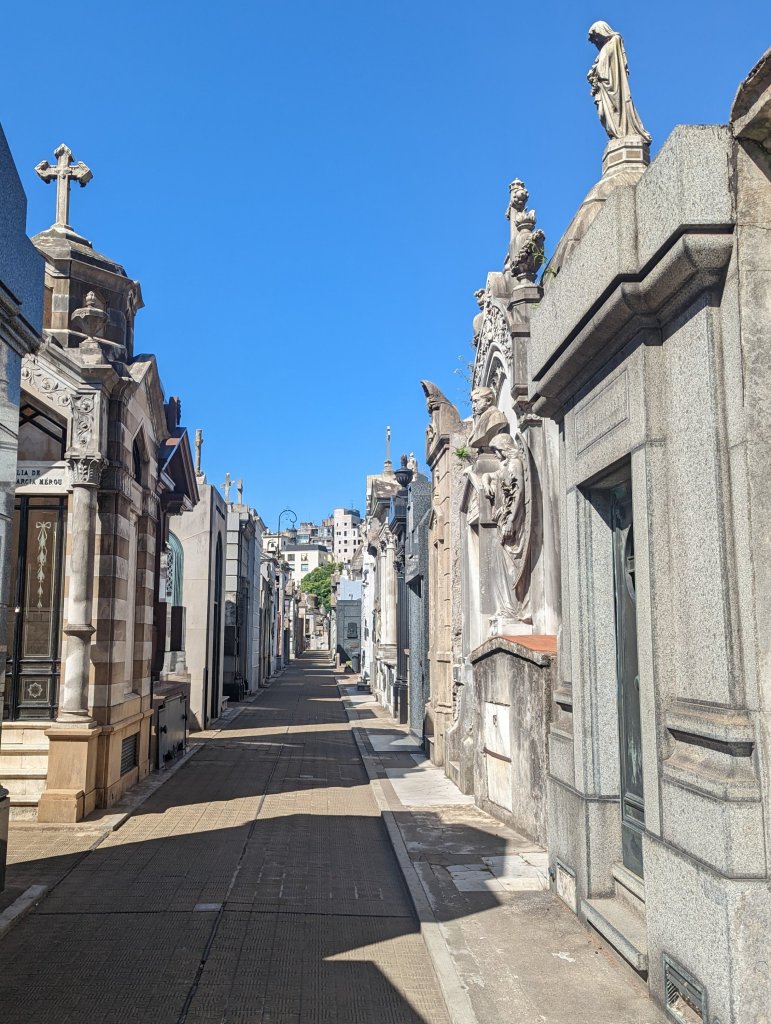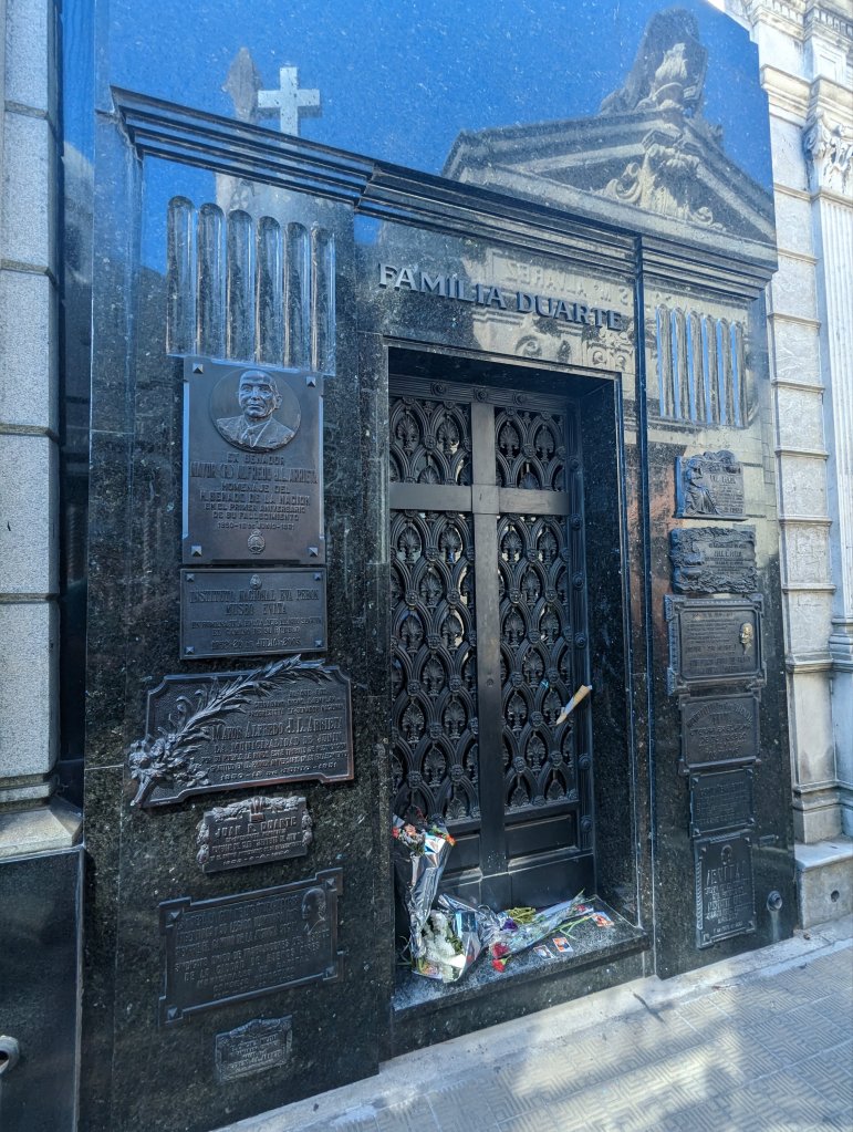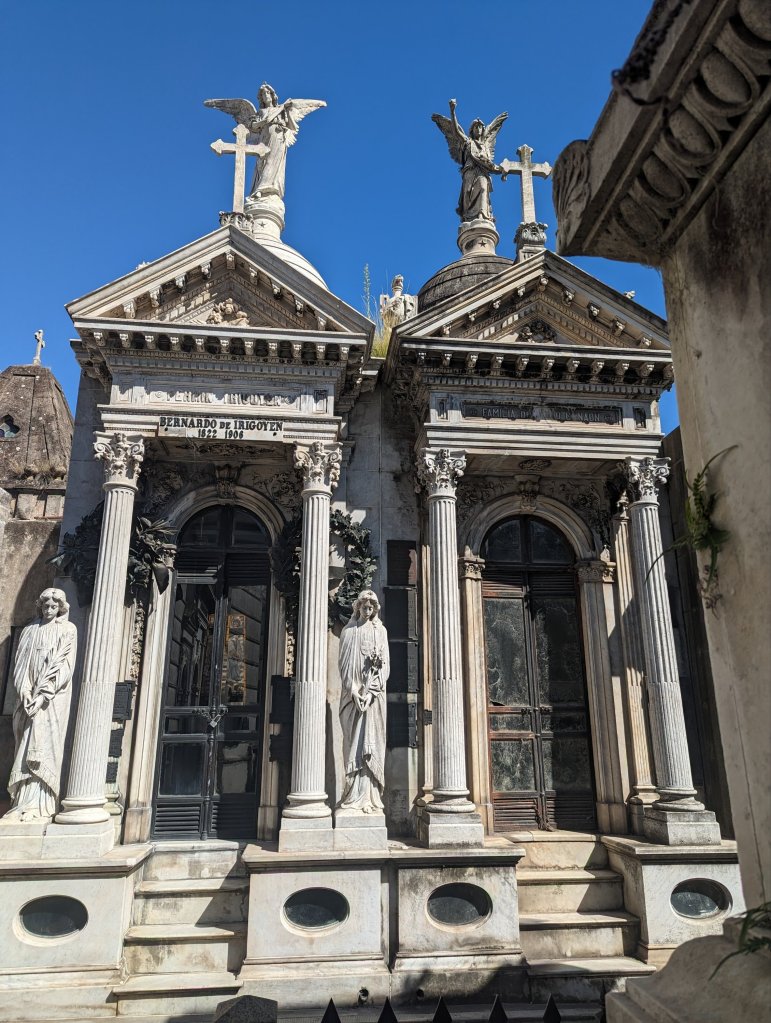 The Recoleta cemetery was first begun by the Franciscans who built the neighboring Church Nuestra del Senora Pilar in the 18th century, which we visited before. The cemetery has become public since then, housing the mausoleums and sarcophagi of stateswomen and men, scientists, military, and people of cultural importance and wealth. Notably, Eva Peron is buried here though I didn’t recognize anyone else. Nevertheless, it’s interesting to stroll around and enjoy the different architectural choices made by the grieving. Many of the structures are at risk of collapsing though some are fairly recent (as from the 20th century). Lots of tour bus groups tramp through but we had most of the place to ourselves.