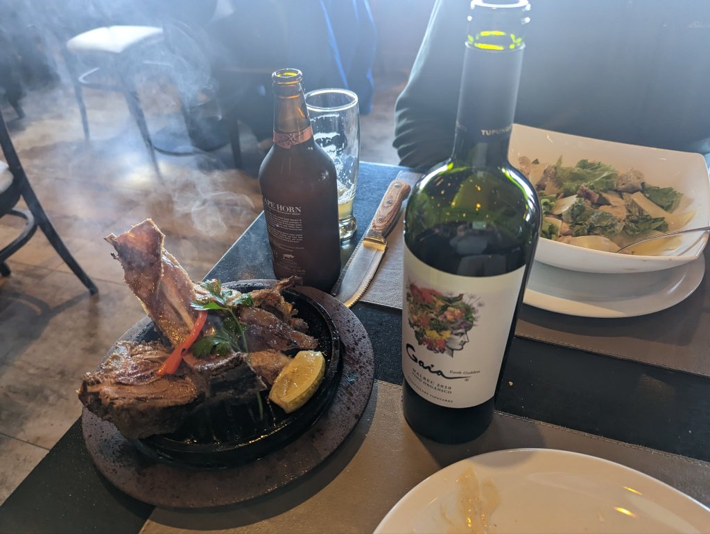 We probably overstayed at Ushuaia waiting to disembark on our adventure cruise. We revisited the prison/maritime/art museum in the morning after checking out of the hotel and taking our bags to the port. Nothing new was learned although we saw some nice water color paintings beautifully presented in the tiny prison cells, now painted white and strategically lit. Another wing of cells was left decrepit and creepy for the real prison experience. Then we strolled til lunch and had wine, beer, and BBQ Argentinian lamb. I “accidentally” drank the whole bottle of wine because, well, language. I mean, I thought I ordered a glass but oh well… Greg was underwhelmed with his lobster empanada but the BBQ lamb was exquisite. Afterwards I allowed Greg internet access while I napped on a park bench near the shore in a gale while a local couple picnicked nearby. I think I love Ushuaia. Goodbye.