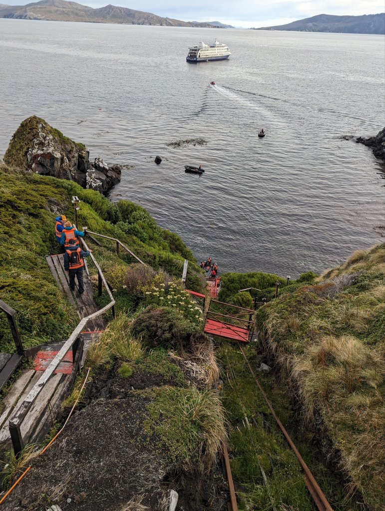 We dressed early the next morning to disembark onto the Zodiacs for our visit to Cape Horn. The sunrise was spectacular and the seas were remarkably calm, so we were lucky. At least 30% of their cruises fail to disembark due to the weather and tempestuous seas of the Drake Passage. Cape Horn, or Hornos Island, is named after the Dutch port from which the first discoverers had started. It’s a treeless, moderately hilly island; the southernmost piece of land in the world at about 55deg latitude. A family lives here, manning the lighthouse throughout a year and they were happy to have visitors. Notably, they have satellite TV and birds for neighbors and that’s about it. We walked the boardwalks to a monument to lost ships and sailors in the shape of an albatross. OMG I’m on Cape Horn!!!