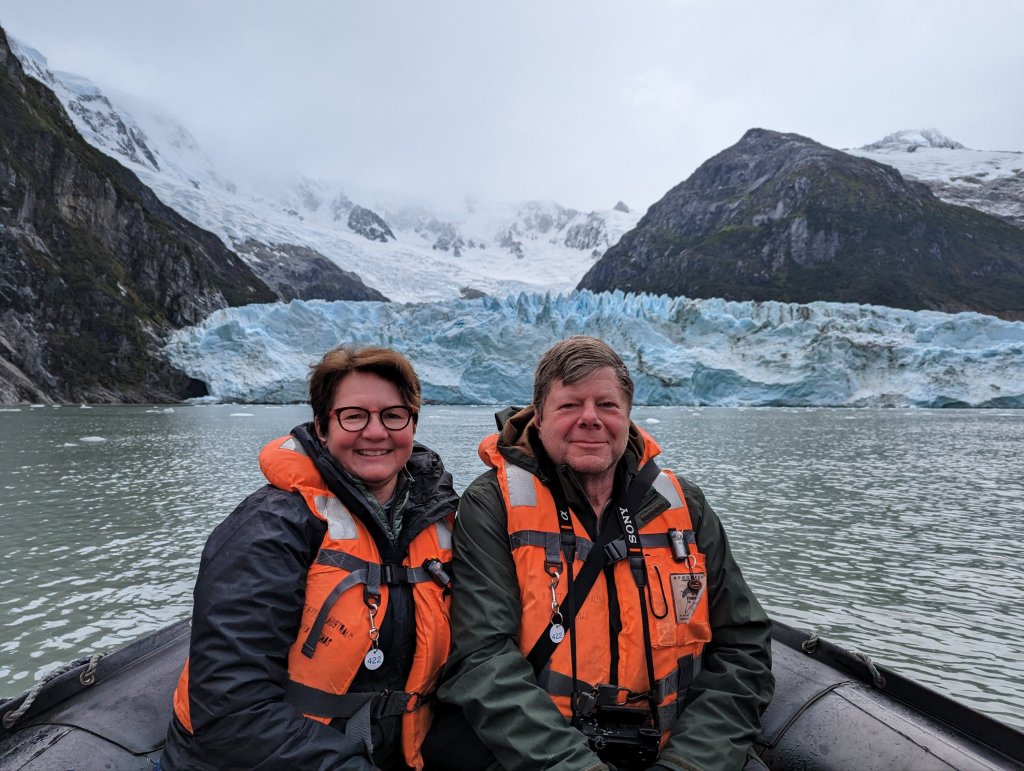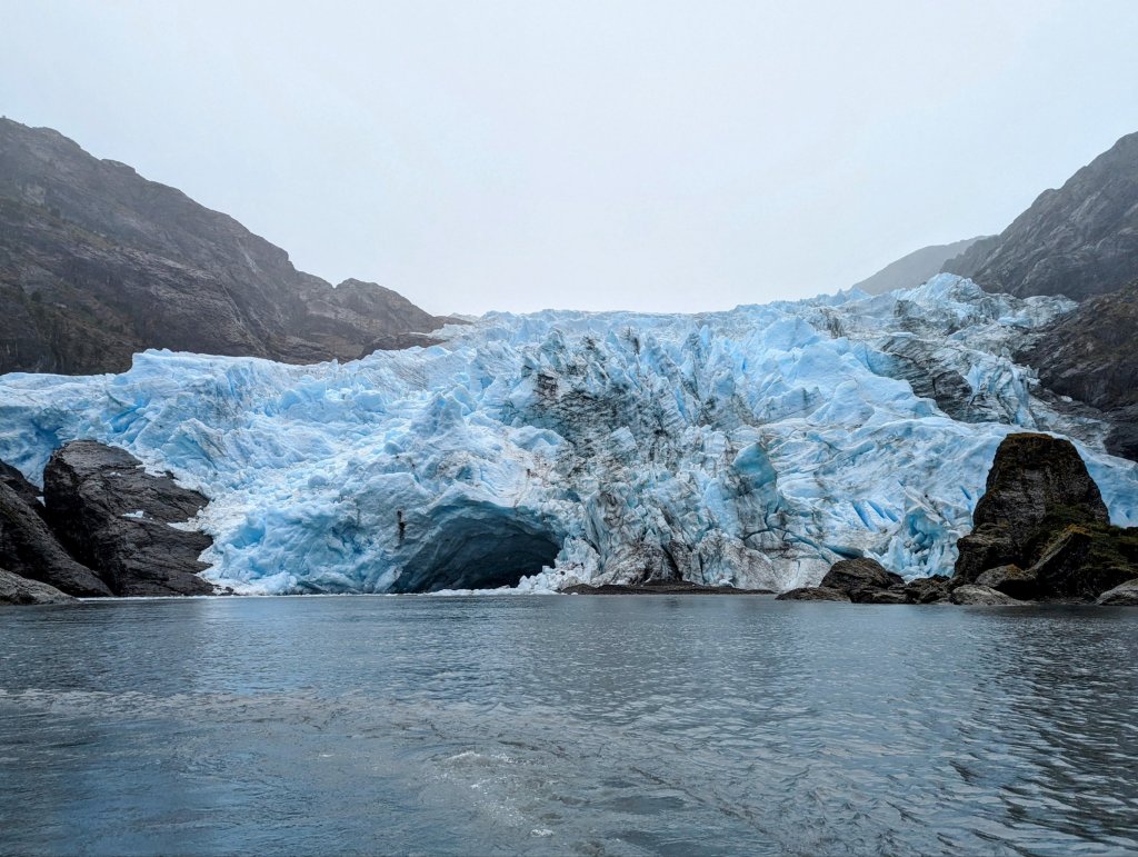 Has it been only one full day? Seems like we’ve been seeing so much. The second day we boarded the Zodiacs again for an up close hike near Pia Glacier. First, though, we sailed down the narrow fjords passing through Glacier Alley at dawn. At the Pia Glacier, one of hundreds of glaciers extending from the Darwin ice field, we watched calving from the tidal front and heard the amplified thunderous crack and splash as the ice hit the water. Our hike took us within 160 meters of the glacier. Our guide was very informative, to wit: the blue color is due to the longer wavelengths red and green being absorbed while the shorter blue wavelength is reflected back; glaciers move 1-2 meters a day; the grey ‘dirt’ is from the glacier picking up sediments from the land it scarifies; the difference between crevasses and seraks, etc. I find all this info so interesting yet I’ll forget it shortly, hence this blog. After lunch we boarded the Zodiacs once again for an hour-long visit to the nearby Porter glacier named after a famous rock climber and activist, Charlie Porter. More info on glaciers was dispersed and lots of good photos were taken all while aboard the Zodiac. There were 4 or 5 Zodiacs with 10-12 guests each visiting in two shifts It was 45 deg with light rain but the glaciers were clearly visible and enchanting. The fjords provided remarkable geologic formations of Gneiss, metamorphosed granite with waterfalls streaming down to the bay. Later we saw sea lions cavorting in the channel as we ate dinner.