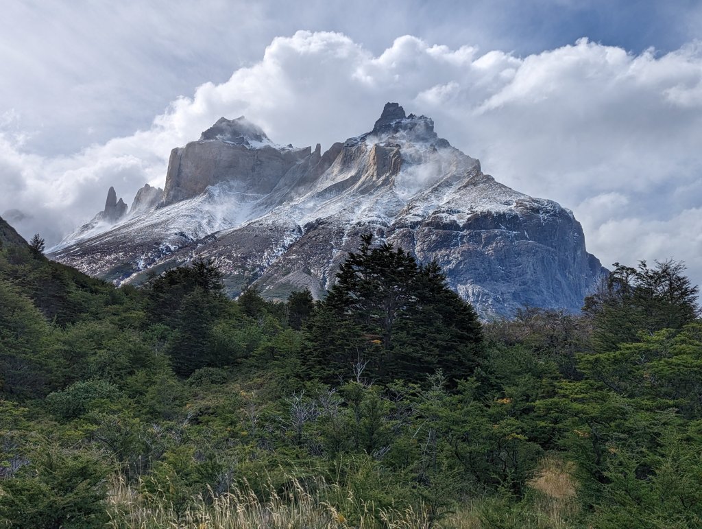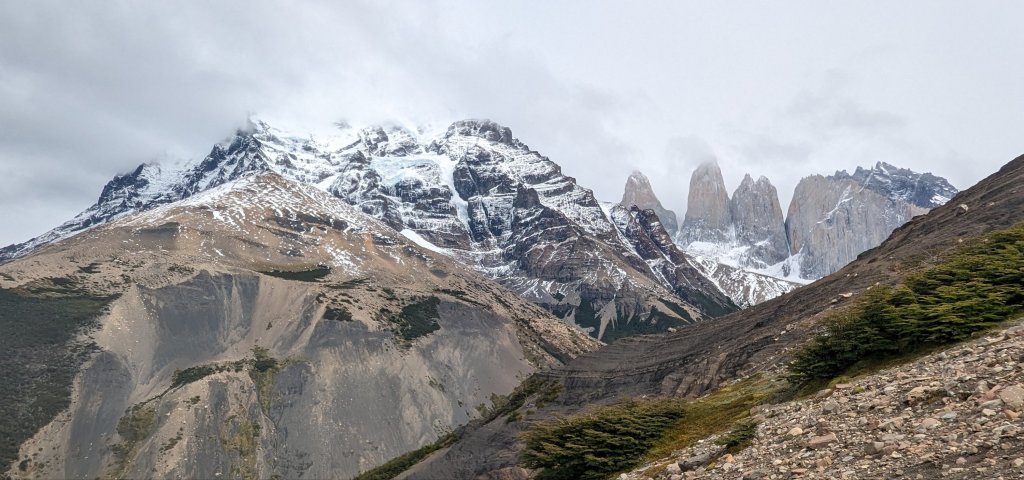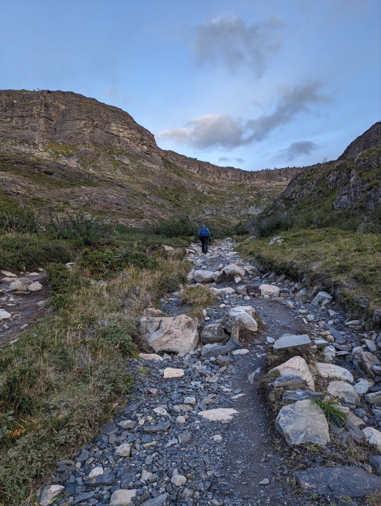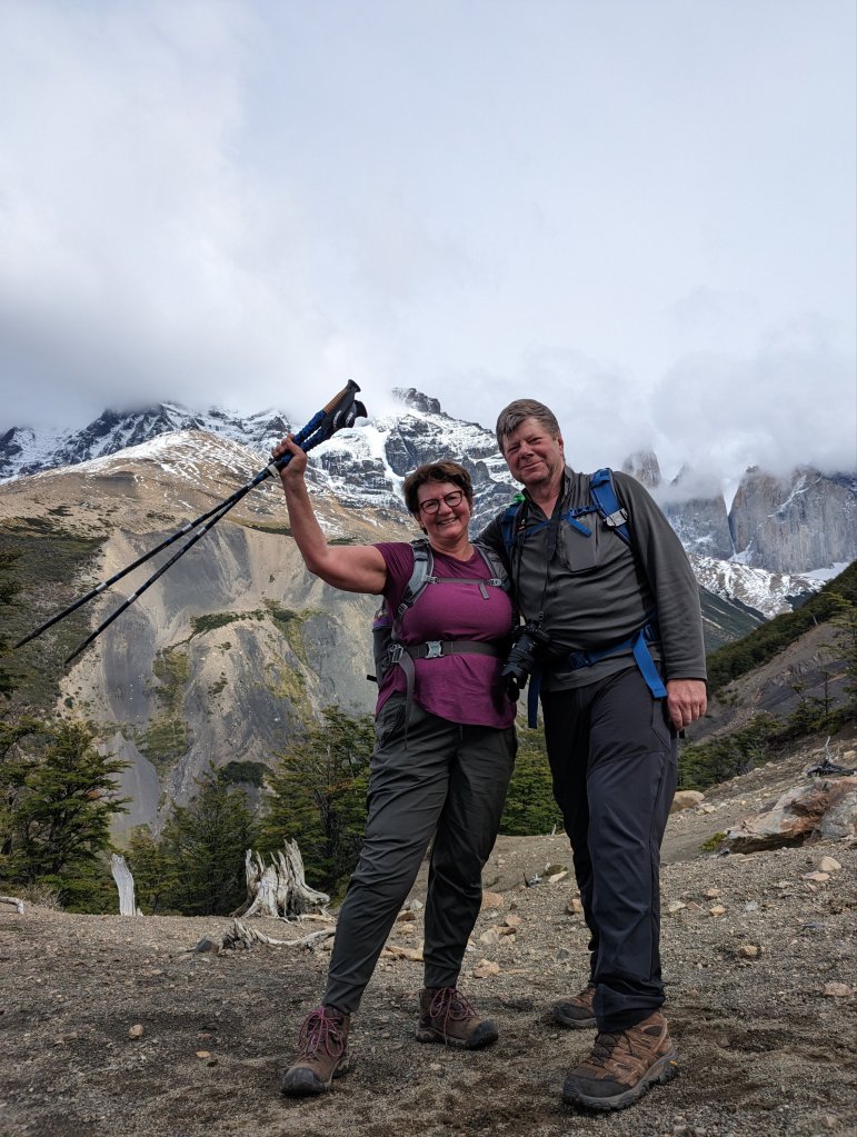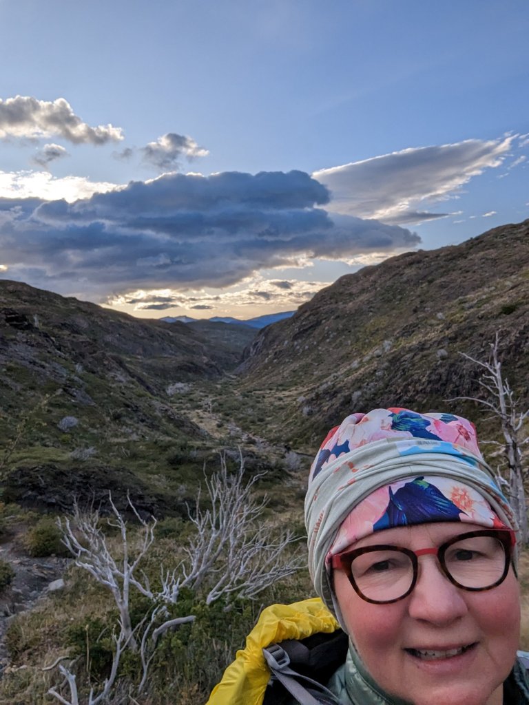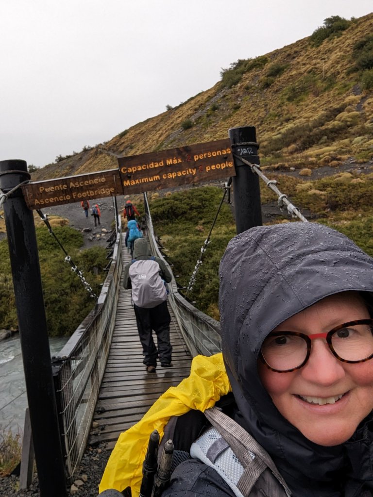 If you go: the season runs from October to early April, we hiked in late Feb. The weather doesn’t necessarily heed the calendar or the meteorologist. Prepare for all weather at any time: sun, heat, clouds, rain, cold, snow, and wind, wind, wind. Weather coming off the Pacific hits the Andes and goes nuts. This means you should be flexible with your plans and/or expectations. Also: most definitely take waterproof gear: hat, jacket, pants, gloves but keep in mind waterproof doesn’t mean it will stay waterproof for hours of rain on end; expect that after several hours of pelting rain you will be wet. It runs down your shoelaces or into the creases of your well worn boots and soaks your feet. Consider the old- school plastic bag over the feet trick. -A rain cover over your backpack doesn’t keep rain off your shoulder harness, which will soak your bag eventually. Consider putting your dry clothes, socks, papers into a plastic bag inside your pack. Or get a good poncho to cover you and your pack; disposable ones will blow around and be useless. -Even new Goretex fabric clothing will soak eventually. Forget old waterproof gear-the finish will have been worn off or washed off ages ago. -Wear layers: I had moisture wicking shirts under a fleece under a nano-puff under a ‘waterproof’ windbreaker (with hood). Everyday I went from all layers to tee shirt and back. -Be sure your boots are broken in, and maybe consider a spare pair of hiking shoes. You’ll need to dry your boots on wet or muddy days. I took one pair of boots and a pair of flipflops for rest and showering at the refugios. -Take Compeed pads or moleskin for blisters just in case. I used an entire package. -We saw a man whose boots were literally falling apart. They were wrapped with kinetic physio tape, duck tape, and whatever else they could find; he had miles yet to walk. a-Sunscreen! -Water is drinkable from streams. Drink enough! -If you are staying at a Refugio, plan on noise and bring earplugs. -Hiking poles are very useful if you have weak ankles and bad knees, like me. -Look behind you occasionally or you might miss some great views.