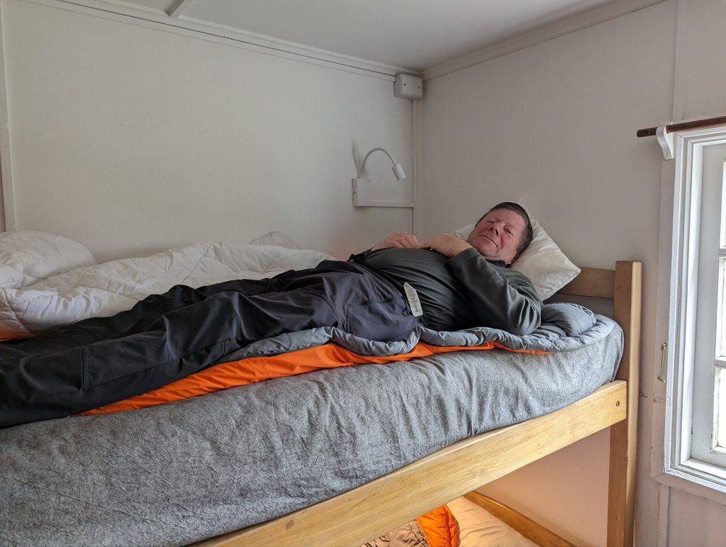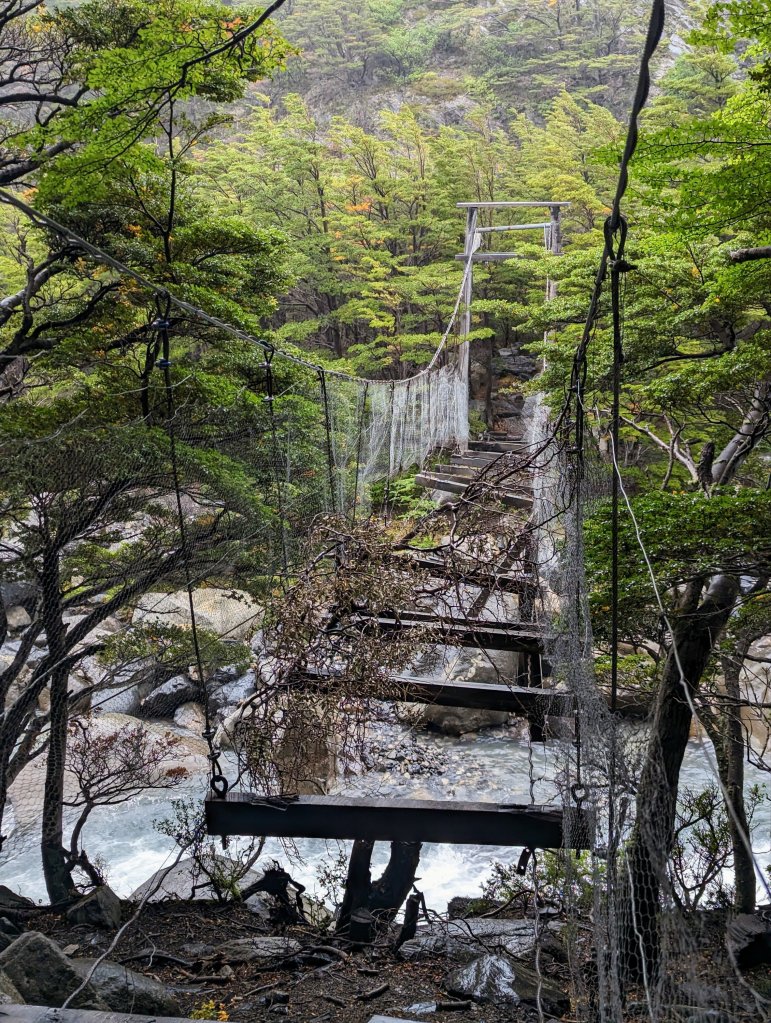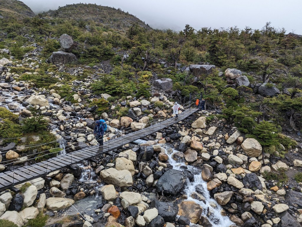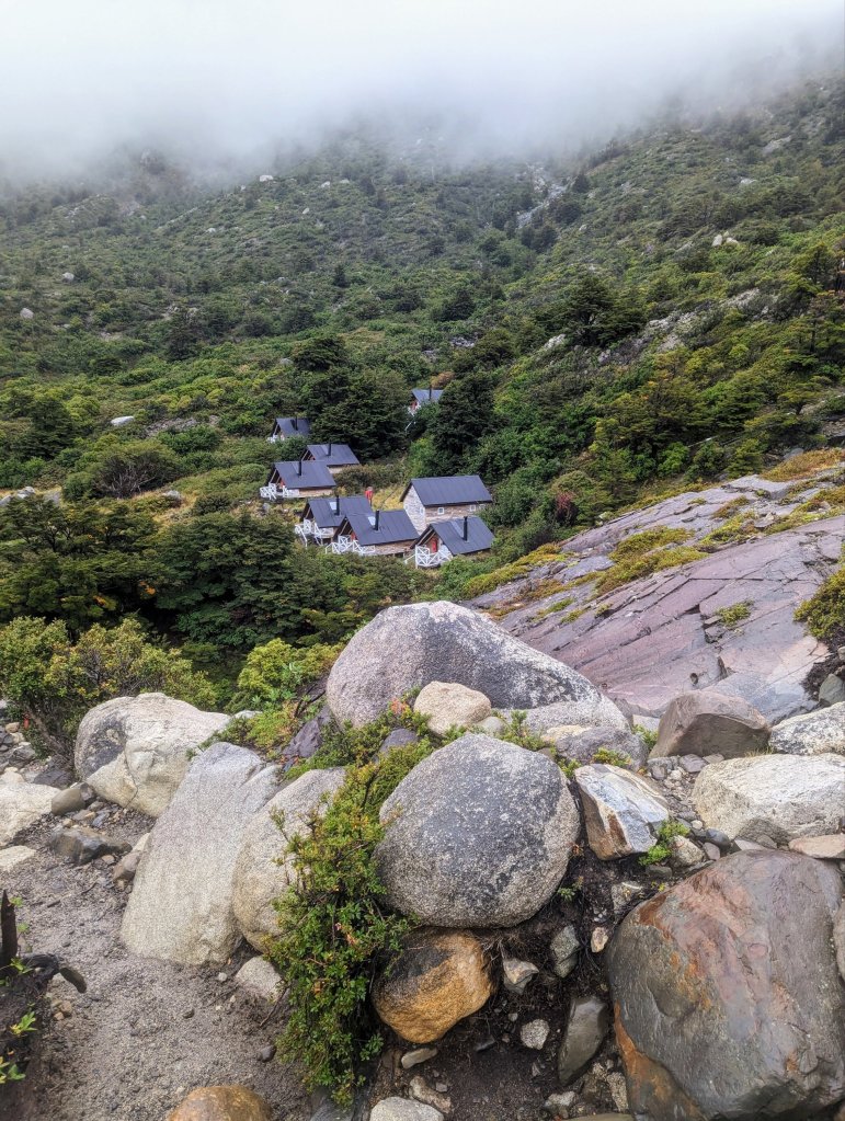 Day 2. Uh oh. It looked like rain in the forecast for the whole day which turned out to be accurate, unfortunately. We had a late breakfast (8 am) and then were headed to the next Refugio 8 miles away at Los Cuernos (“The Horns”). I don’t remember much at this point, views were limited due to the rain. We hiked along Lago Nordenskjold with the mountains to our right. Every now and then a mountain view would peek through the low hanging clouds to motivate us. Baru found a relatively sheltered location (under one of the rare trees in the area) and served us the hot, sweet tea he carried every day to enjoy with the bag lunches we carried ourselves. He carried a huge pack for a diminutive man including camping gear (he tented each night), safety items for the group, tea for midday, ground coffee with a French press for breakfast, avocadoes and peanut butter, all the important stuff. Soaked to the skin despite our waterproof gear, we were tired yet delighted to cross a raging glacial water river and see our cabanas at Refugio Cuernos after another 6 hour day. We had a fire in the tiny cabin stove that Greg used to dry out our clothes with a jury-rigged BBQ setup using overlapping hiking poles as drying racks. The rain forced everyone staying there, in cabanas or tents, into the tiny bar area so it was quite crowded. Baru, despite his tight relationship with the refugio crew honed over 7 years as a guide, was unable to get our dinner time moved up so instead they comp’d us free drinks and Chilean charcuterie while we played cards and Jenga. Baru taught us Nerviosa, a fast paced, slap card game similar to War. Steve and I killed at Spades even though I was new to the game (beginner’s luck). It was a great night although our delayed dinner time (salmon again) meant the fire in our cabana went out and a chill set in overnight. Despite that I could see the bright stars of the Southern cross through the skylight above my bed. Elevation approx. 800 feet, 8 miles, 6 hours.