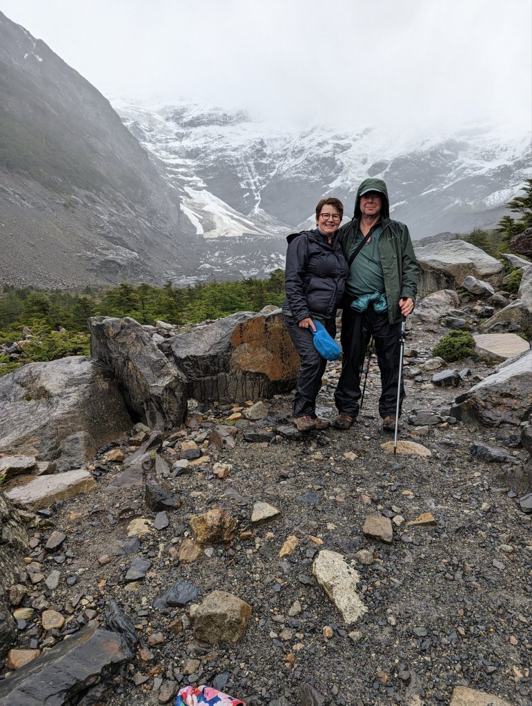 Day 3. Sun!!! The Cuernos peaks towered above the Refugio and reflected gold in the morning sun. Baru had French pressed coffee ready at breakfast and then we headed out to the French Valley and the Frances glacier. We hiked a couple hours to the ranger station at the head of the valley to drop our packs which we collected later. It had started to rain so we geared up. On the muddy path we ran into an Indian couple we had befriended on the ship to Cape Horn who were hiking one day in the park. It was nice to see them again. Then we continued up the valley and along the glacial river and up in elevation, through forests and glacial moraine and running rain water throughout. We reached the Mirador (lookout) from whence we could see the glacier, covered with dirt and pebbles from its slow, chaotic journey. Not a pretty glacier but pretty impressive nonetheless. We could hear avalanches in the peaks above. With the weather as it was we decided not to continue for a closer look to Britannica Point and returned to the station and our packs. Baru, ever the friendly guy, had arranged for our group to lunch inside the rather rundown building but it was warm and dry, unlike where all the other hikers rested-outside. While dining on sandwiches and Baru’s tea we watched as another hiker had his completely degraded boots taped together with kinetic tape, duct tape, bandage tape, anything that would keep them together. We continued on, the sun now returning, crossing glacial streams and meandering hills. Turning back we saw the Cuernos and other peaks from the other side. The mountains were magnificent in the crisp, clean air. Short dead trees covered the mountainside, the remnants of a fire in the early 2000s from a hiker burning his discarded toilet paper. 17,000 acres burned. Eventually we could see the next Refugio on turquoise colored Lake Pehoe, Grande Paine towering above. Grande Paine Refugio was larger than Los Cuernos and very busy. After showering and changing and lucky enough to get our boots close to the fireplace to dry, we had dinner, chicken or pork buffet, and went to bed early. Others in the Refugio were obviously less tired and talked outside our room til 11pm. Ugh. We were back in a bunk room now shared with 2 others so I ended up in a top bunk. I managed to not have to pee in the middle of the night, thankfully, because I had no idea how I’d get down without falling. Elevation, a rolling 758 feet, 11 miles, 8 hours.