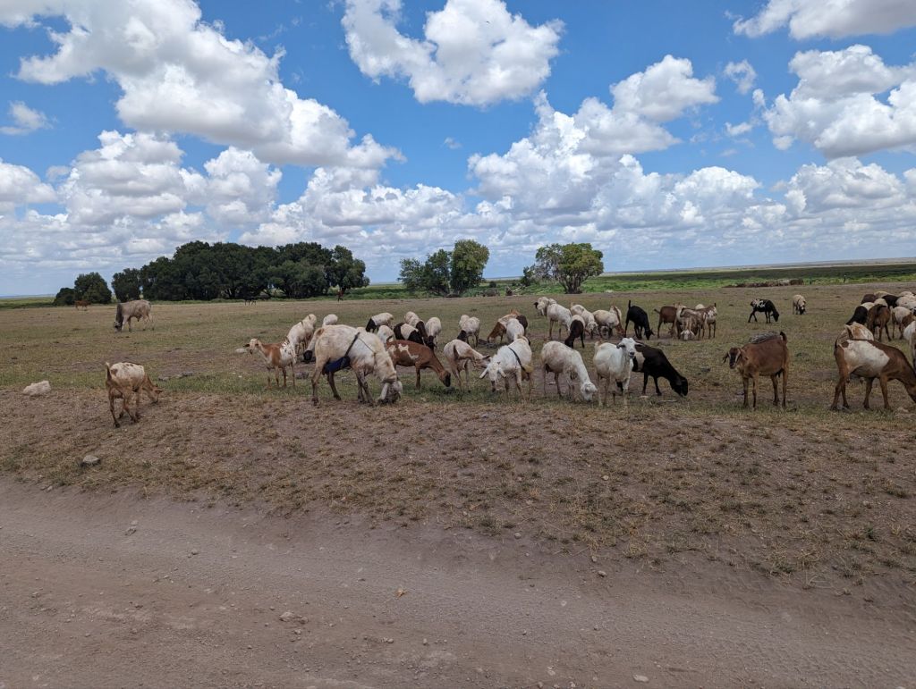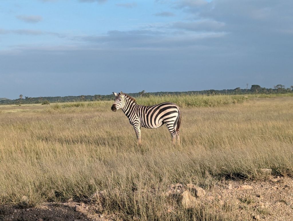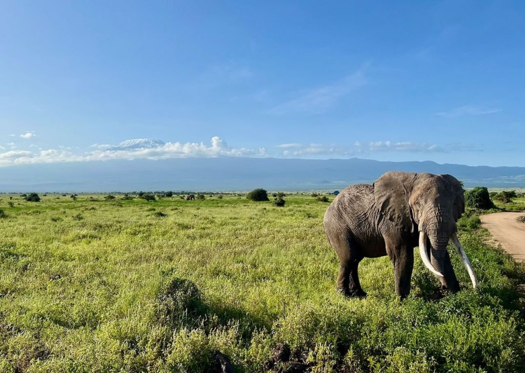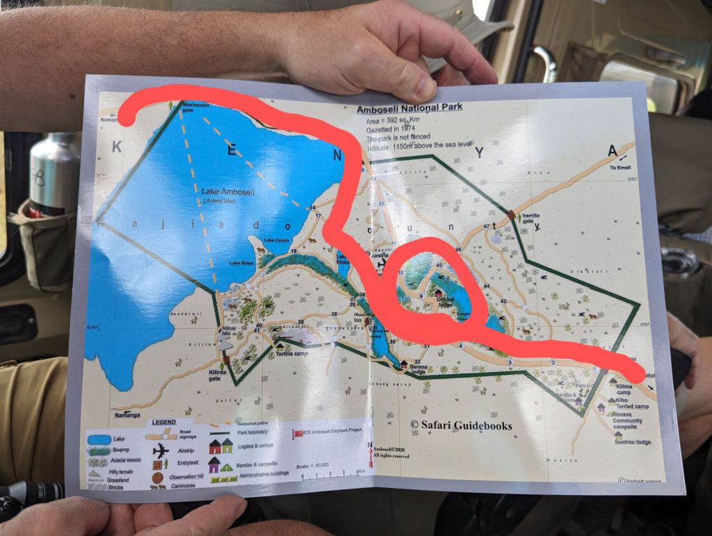 Soon we stopped at a tchotchki market with decent bathrooms and then turned off the Mombasa-Nairobi road. Eventually majestic Mt. Kilimanjaro came into view although it was shrouded with clouds. Occasionally glimpses of the snowy summit peaked through as the clouds thinned. “It was sleeping” our guides told us. After a further 2 hours and back in savanna country we entered Amboseli National Park. Amboseli has marshy grasslands excellent for viewing animals and with the recent rainy season there was plenty to see. Our bumpy ride to our lodging took about an hour serving as an introductory game drive. We viewed giraffes alongside zebras, impalas, and antelope. We’ve arrived! We’re on safari!
