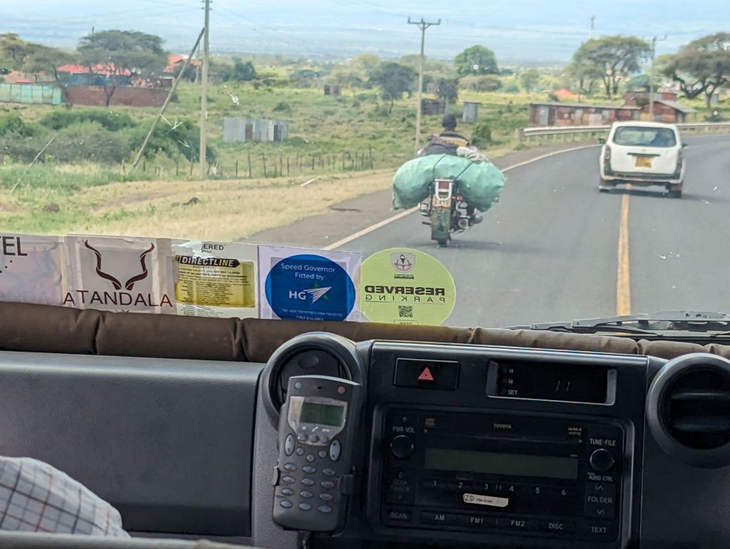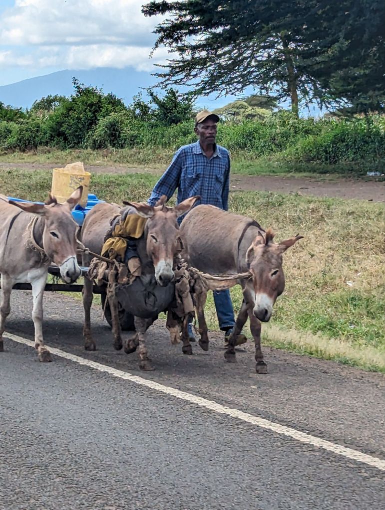 People walked along the highway alone or in groups miles from anywhere obvious. Where were they headed? Some were well dressed and were walking to church services as this is largely a Christian nation. We heard the jubilant singing emanating from open windows and doors of the modest churches. Ramshackle roadside stalls abutted the side of the highway but most were empty until after church services let out. There were “rest stops” which were indicated by speed bumps and trucks parked randomly alongside the widened lanes, the drivers visiting the market stalls that were selling fruit, vegetables, water, trinkets, solar lights, used sneakers, and hardware. Goats and cows were scattered about the markets and on the berm watched by herders. Block and wood fencing was brightly painted with the paint company advertising its logo. Just 20 minutes outside of Nairobi three giraffes slowed traffic by running across the road. I don’t want to know how long that car repair would take! Houses were sparsely spaced, some under construction that takes years as funds become available. There were shacks, sheds, and even some McMansions. We passed a few huge cement factories which supplily the construction needs of so many houses and buildings.