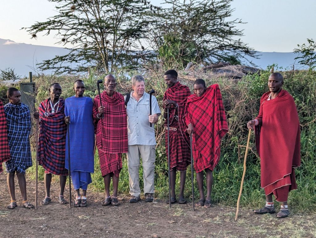 Another early start on Monday had us in the Land Rover before dawn to visit a nearby Maasai village. Mt. Kilimanjaro was azure blue as the sun rose to light it. A hot air balloon sailed in the distance. Then we saw groups of schoolchildren in royal blue uniforms walking about 2 km to school, each carrying a log or branch to contribute to the school. At the village we were greeted by the chief, Joseph, and his brother Thomas. They were attired in the traditional red blanket or “shuka” and blinged out with beaded and be-sequined bracelets, necklaces, and earrings. It looked like the whole village came to greet us with a welcoming song (I assume) and invited us to dance with them. The simple jumping and dipping was doable for Greg so he happily participated. The Maasai were so joyful and pleasant, smiling beautifully, young and old. We learned about their culture: how to start fire from rubbing sticks together, visited their dung-daubed, dark huts, had a charming show from the preschool children- singing for us and displaying their math abilities, and of course, were invited to shop their wares. Multiple wives are permitted; the first an arranged marriage but additional wives are of the man’s own choosing. Each wife requires their own house. Some go on to college, some return, some do not. The chief was college educated and now is a teacher in the village. He has 2 wives. The villagers herd goats and cows, keeping them within the circle of huts each night for protection. We learned a lion had taken down an animal nearby the previous night! Flies were abundant, often covering the eyes of the children. Shoes were ingeniously made of tires- the original Crocs. There is no electricity but a well and storage system was donated. This was a wonderful visit and exposure to a very simple peoples’ way of life, to wit: I didn’t mind overpaying for the craft items I bought there (and I stink at bargaining anyway). On the short return to the lodge we waited while a bull elephant passed within 10 feet of the vehicle. All this before breakfast!