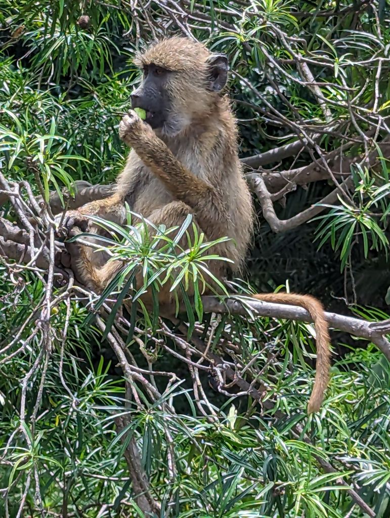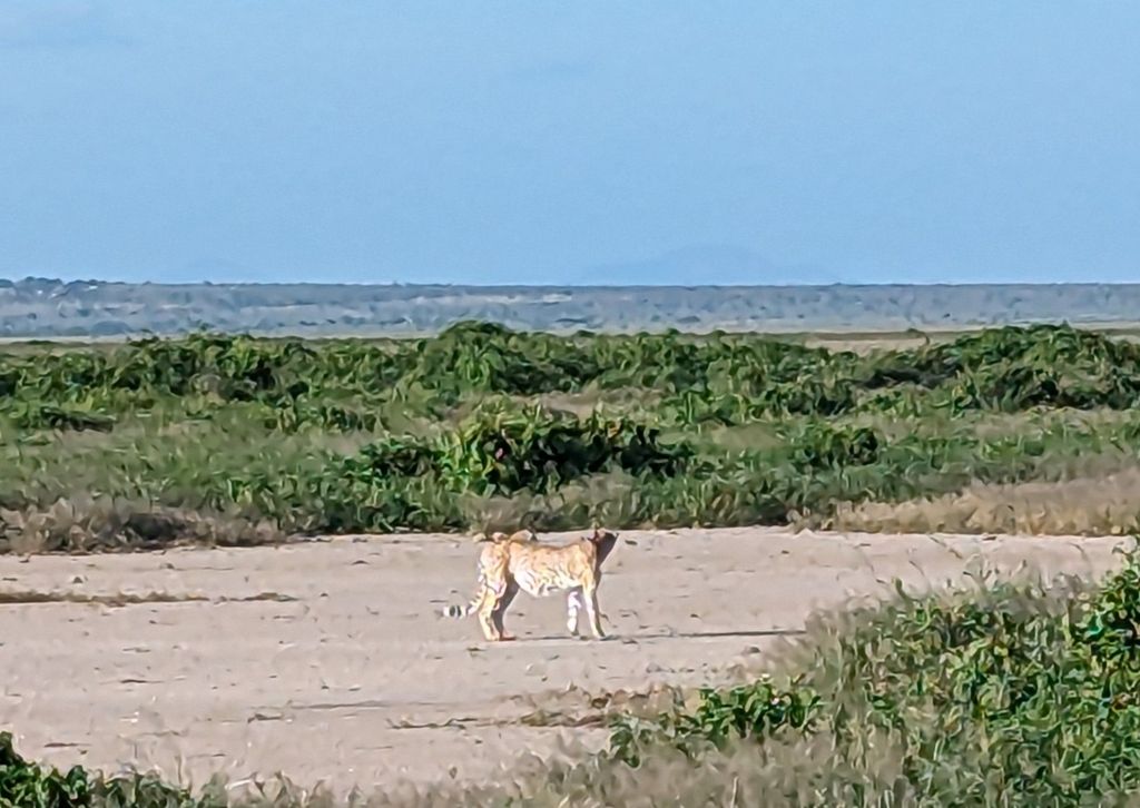 We spent the rest of the day on game drives with lunch in-between (more Indian food, I love mango relish on naan). We were able to see many herds of elephants and single bulls, a dazzle of zebras, a tower of giraffes, a bloat of hippos, a troop of baboons,many herds of gazelle (Grant and Thompson), a pair of water buffalo, a flamboyance of flamingos and many other birds including crown cranes and ostriches and Egyptian geese, also one spotted hyena, one wildebeest, one lion (in the distance), and the last sighting of the day: two cheetahs feasting on an ostrich. About 25 tourist vehicles jammed 3 abreast on a single lane road to catch a glimpse of this remarkable sight. Tomorrow: Tanzania!