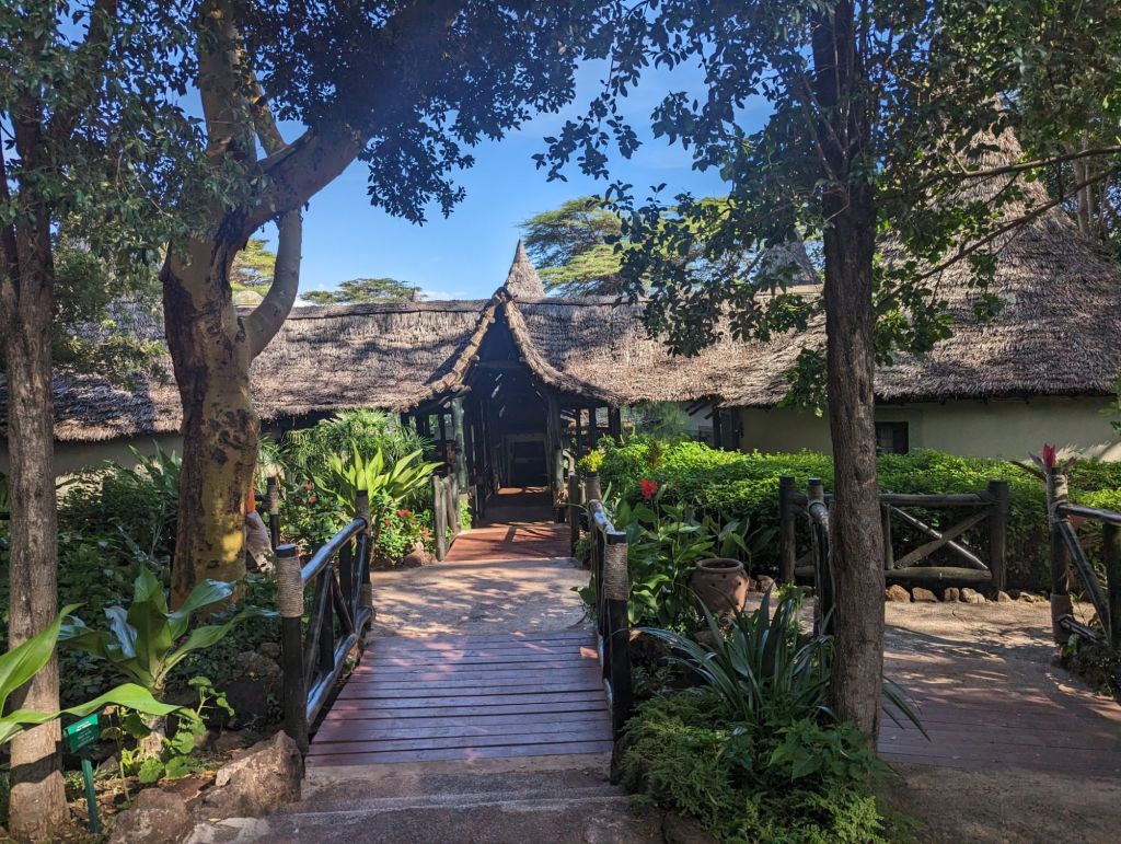 Our beautiful hotel was again decorated with African murals and fabric prints and we stayed in a hatched roof palapa. There was a refreshing infinity pool overlooking Lake Manyara below. We chatted with other “safarians” (I just invented that word aka safari tourists) then watched a very good, vigorous acrobatic show poolside before enjoying an outdoor evening BBQ of goat, chicken, and beef. And some Indian sides. Early the next morning we headed down to Lake Manyara National Park. This park was a jungle, unlike the grasslands and savanna of the other parks we have or will visit. Thus, it was harder to spot animals except for the baboons which were everywhere. We watched a troop of at least 50 scoot down a riverbed. There were also plenty of birds. Eventually we came to the Lake Manyara shore which has now exceeded its banks. We stopped for a refreshment under what could be the world’s largest spider. Heading back we saw more zebra, dyk dyks, and a small herd of elephants maneuvering around our vehicles on their way from here to there. They politely skirted our vehicle to within an arms distance. We also saw giraffes feeding from acacia trees but alas, no tree climbing lions. On our return we stopped at an upscale market free of hawkers and spent more than we expected on souvenirs we didn’t intend to buy. There was an interesting teak carving workshop within so we stopped to do some woodworking.