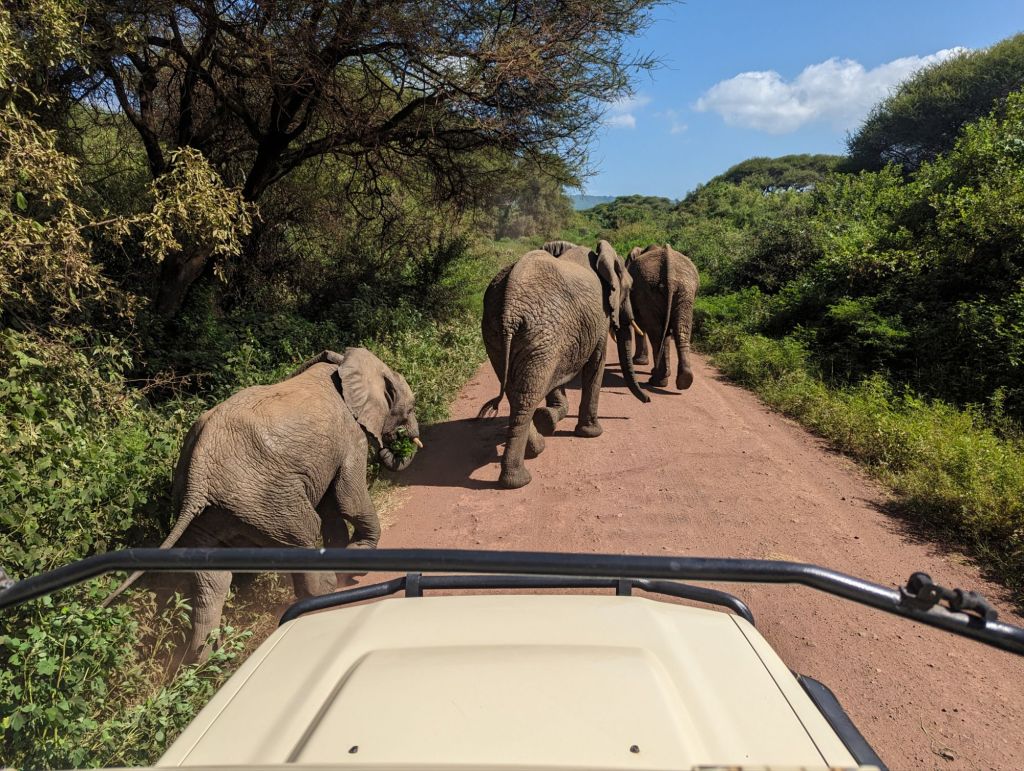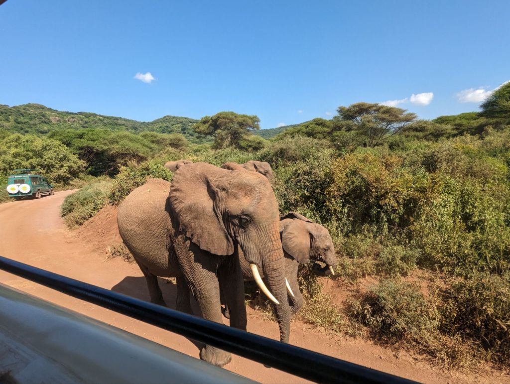 After 2 wonderful days in Amboseli National Park we headed for Tanzania. I had woken up with vertigo which I had only once before about 4 years ago. Ugh. It hit at breakfast so Greg helped me to the lobby where I waited for the dizziness to settle (and was close enough to the restroom to return my breakfast). We got on the van and headed out of the park on the rugged roads which probably settled the vertigo with my stomach settling about 2-3 hours later. I missed most of the 100km drive around Lake Amboseli to the border town of Namanga with my eyes closed. I could, however, still feel the many road washouts and flooded areas which we had to slowly navigate over. Lake Amboseli is typically dried up but with the recent heavy El Nino rains the lake is over flowing and the landscape is atypically lush. I felt much better by the time we processed through Tanzania immigration, handing our crisp $100 bills over with our visa application, passport, and yellow fever vaccination card. It only took maybe 20 minutes whereas lines of freight trucks spend hours processing through immigration and customs. Maasai women were hawking beaded goods outside the customs office while we transferred to a Tanzanian company Toyota Land cruiser heretofore known as a “jeep”. Johnson was our new Tanzanian driver.