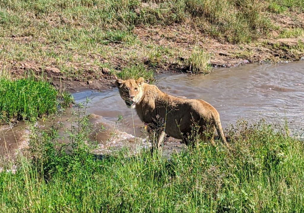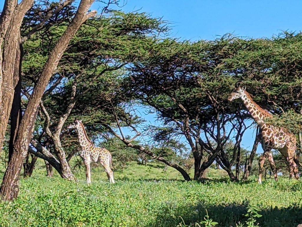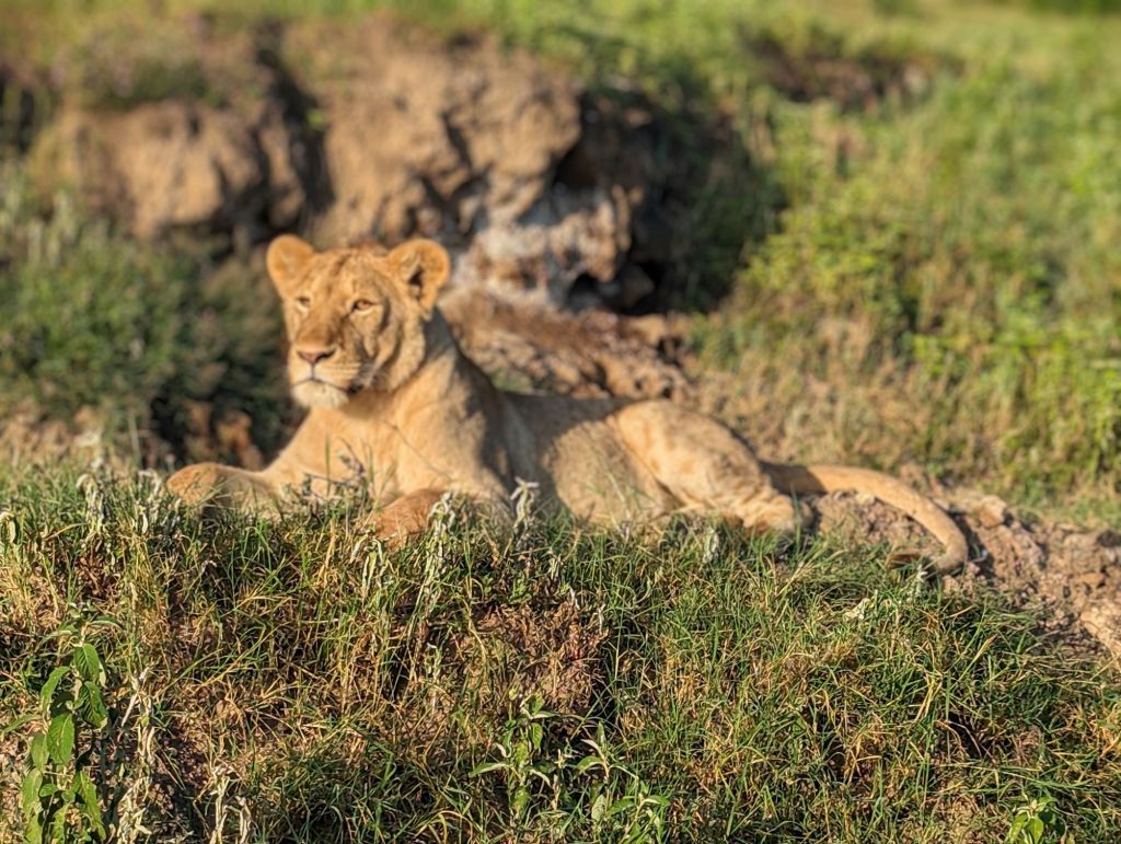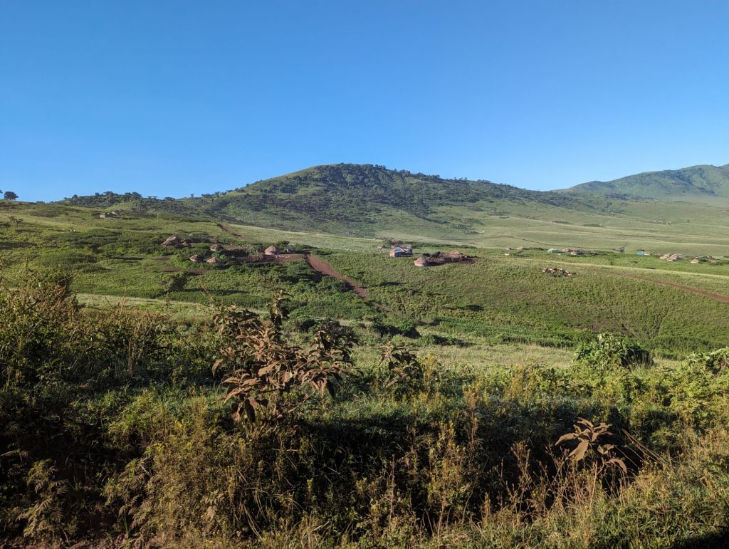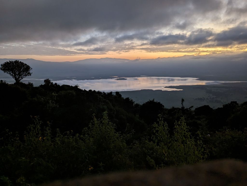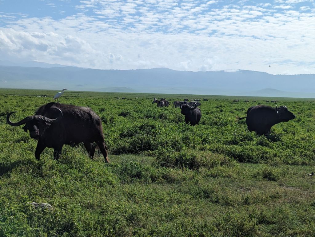 Ngorogoro Crater is a volcano that exploded and collapsed inward on itself about 2-3 million years ago. The approximately 19,000 ft peak become a circular rim of 8,000 ft elevation surrounding a flat, grassy plain at 5,900 ft elevation. Thus, technically, it is a caldera but I’ll go with the common nomenclature. The grassy plain and lakes encompass about 100 square miles within. Ngorogoro is named after the sound of a cowbell by the Maasai. Maasai villages are scattered all around the crater and herders can be seen watching their cows and goats on the rim. Within the crater is the Ngorogoro National Park where scores of animals live for several months as they give birth and prepare for the Great Migration. We visited in February which is birthing season for wildebeest and antelope. These grazing animals prefer the shorter grasses and plentiful water meanwhile, predators like lions, hyenas, and jackals find plentiful prey. Hey, it’s the circle of life!