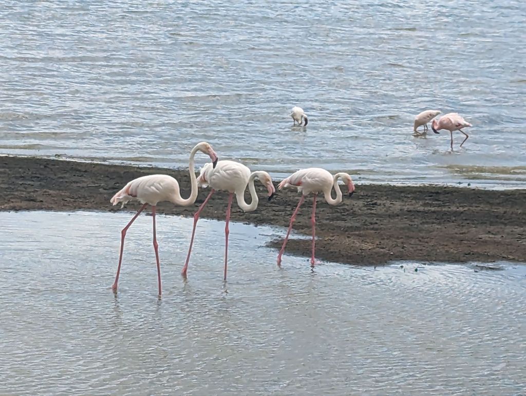 Our first encounter was with a lioness and our patience paid off as she finally lifted her head proudly as she basked on the morning sun. Down on the crater floor wildebeests were nursing calves which stood (or fell) on wobbly legs having birthed less than an hour before. Wildebeest and antelope babies are capable of running within a few hours of birth, out of necessity. A water buffalo just stood there gazing out, thinking who knows what? We saw jackals searching for wildebeest discarded placenta then being chased off by sentinel adult wildebeests, lions sleeping in depressions in the grass, a pride of lions lazing near the water, elephants eating grass, hippos in the shallow lake, flamingos, zebra, cape buffalo, more lions strutting right next to the jeep- “head inside” warned George. The Jeep drivers set up a picnic tea near a hippo pond and a “7 star bathroom” in the park and indeed, the facilities were first rate as well as the snacks. The highlight was finding a few black rhinoceros in the distance. The black rhino is critically endangered so we were very lucky to find them.