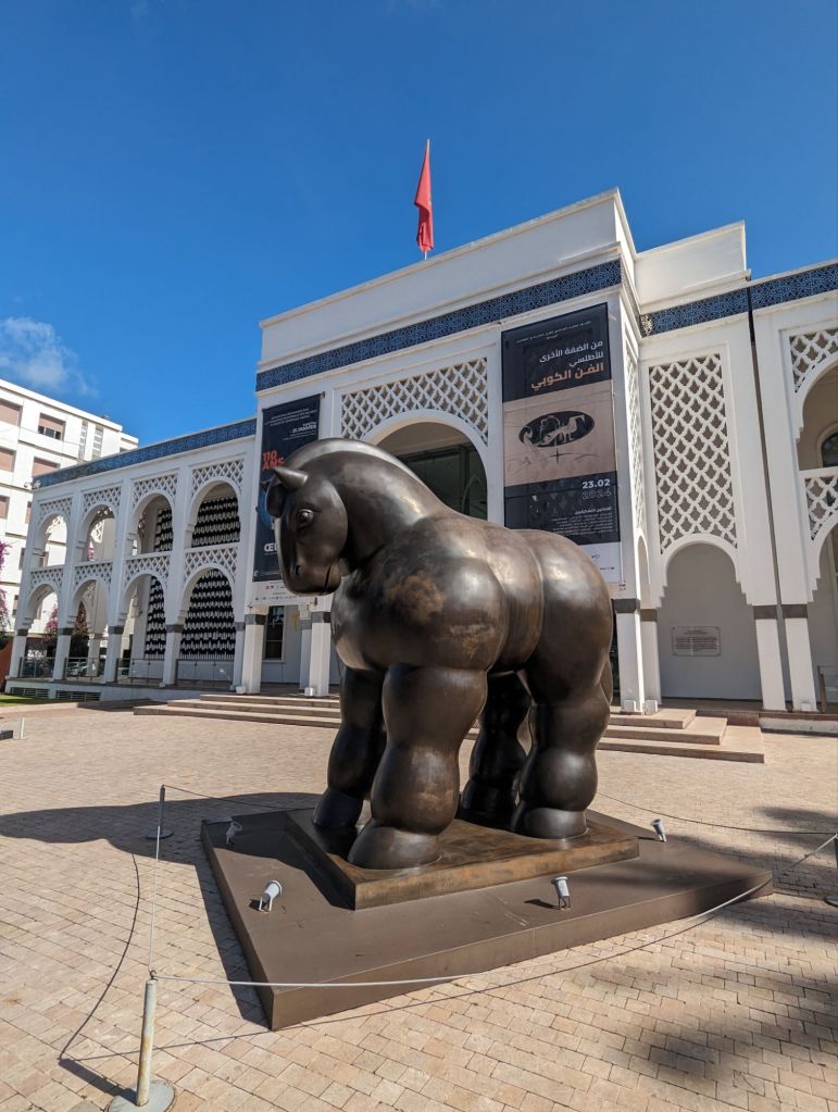 Our first day we boarded the bus driven by ‘Bob’  and assistant Yusef to visit local Rabat and Sale sights.  We stopped at the entrance to the King’s Palace to observe the beautiful guarded gate and learned a bit about the monarchy and history of politics in Morocco.  There are 36 parties in Moroccan government. The King and Prime Minister lead the executive branch while the legislative has 2 chambers.  The current king is Mohammed VI, son of Hassan II who reigned from 1961 to 1999 and grandson of Hassan II, the first king of Morocco. Next we visited a museum of archeology with local artifacts from Morocco, especially from Volubilis, a Roman ruin nearby.  We also visited the modern art museum.  Modern art still hasn’t grabbed me (“untitled”? I mean, doesn’t the artist know? How will I?) But I recognized Botero’s horse, donated by the king.
