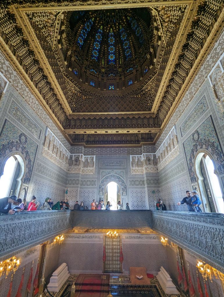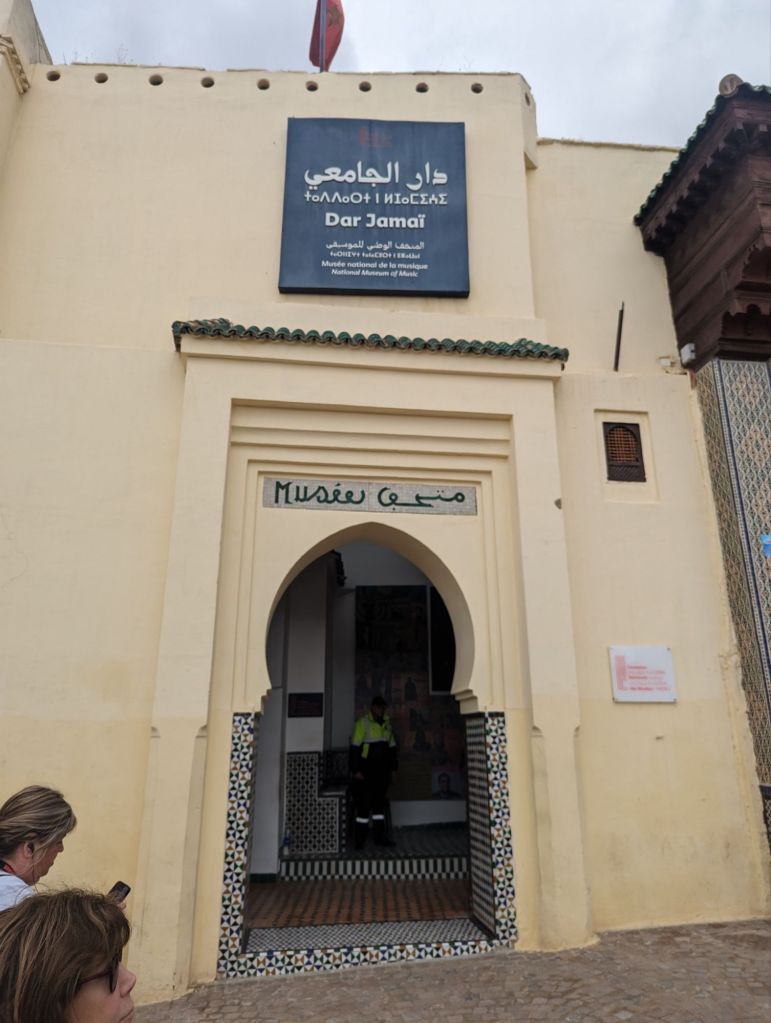 Meknes appropriately translates to “city of olives” and was the capital of Morocco in the early 18th century.  Now there are 1 million people and many schools and colleges. We drove through miles of olive groves as we approached, arriving at Meknes about 2.5 hours later.  Meknes is a triple walled city built by Moulay Ismail, an Awali Sultan and second ruler of Morocco whose reign lasted 55 years.  He was particularly brutal and paranoid as well as being a sex addict.  With 4 wives and 600 concubines he fathered over 800 children.  The city was considered to be the Versailles of Morocco as he was a friend to Louis XIV of France.  Moulay Ismail built a fierce army of sub-saharan slaves called the Black Army.  The wallty has multiple intricately carved and tiled gates; the walls stand up to 20 meters high. Meknes is currently under restoration under UNESCO direction so there’s scaffolding everywhere as they replaster the pastel  colored, crumbling walls and rebuild the medina stalls. After a visit to the medina and quickly perusing the wide array of goods in the narrow marketplace (piles of nuts, shoes, veggies, clothing) we visited a music museum with ancient musical instruments and videos on construction of them.  The building itself was stunning with the intricate mosaics and carved wood.  We lunched at another beautiful riad, again tucked away in a deep alley, this time dining on chicken couscous and veggies.  For dessert: orange slices sprinkled with cinnamon and confectioners sugar.  And tea.