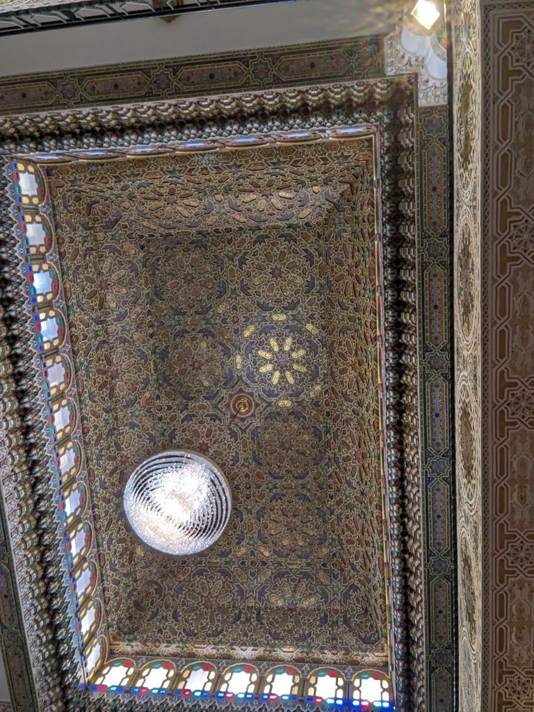 We spent time walking the neighborhoods around the hotel which were mainly businesses, schools, or embassies, and a park.  We visited a local church, St. Peter’s, which was built in the early 20th century.  It was light and airy and spacious but with some Moroccan details and stucco carving above the windows.   We failed at our first attempt to withdraw Dirham (Moroccan currency, about 10:1 exchange rate with USD) but were successful later.  That night Greg and I dined at the Moroccan restaurant at the hotel served by gentlemen in white jallaba (caftan robes with a hood) and red fez hats.  We ordered too much food and a nice 1/2 bottle of Medaillon Cabernet.  Lamb couscous and kefta kabobs.  Yum! The next day we wandered around again avoiding the sporadic showers which Moroccans were grateful for as they are suffering a 3 year drought. The rest of the group and the tour director, Salah Eddine, arrived and we dined at the hotel buffet while suffering the stampede of other guests who don’t know the meaning of ‘queue’.  Or ‘excuse me’.