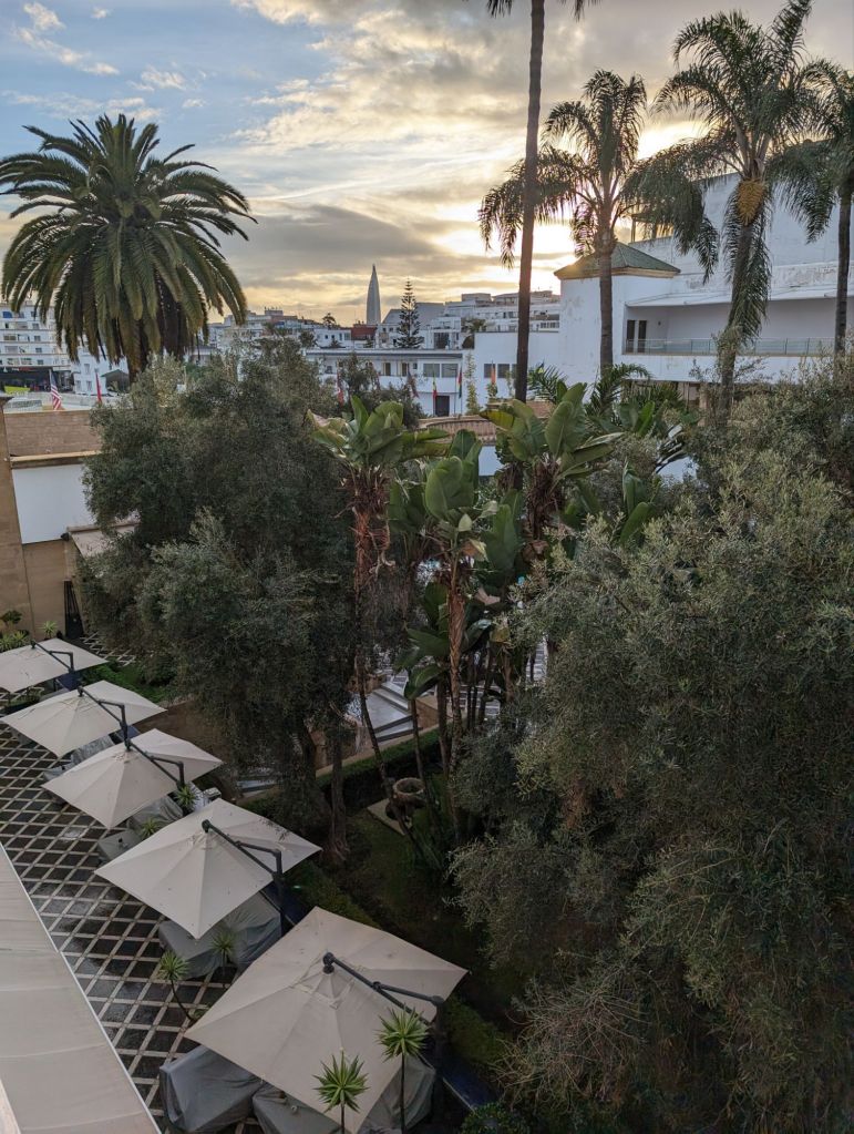 Our Lufthansa flight arrived 2am in Casablanca.  We were met by our Odysseys Unlimited Tour rep and driven 1.5 hrs to Rabat, the capital of Morocco, on the Atlantic coast southwest of Tangier.  We passed numerous checkpoints along the way but our van, the only vehicle on the road at the hour, was unhindered.  We arrived at our hotel, the La Tour Hassan Palace, at 4 am and promptly went to bed.  We had 2 days to rest and explore before our organized tour of Morocco began. (We had booked our own flights but had OU book our transfers and hotels). The hotel was magnificent with its mosaic walls and intricately carved moldings and doorways.  The central garden and pool area were inviting, though the water was cold and there were occasional sun and showers.  The air conditioning was nonexistent but we kept the windows open and all was well.