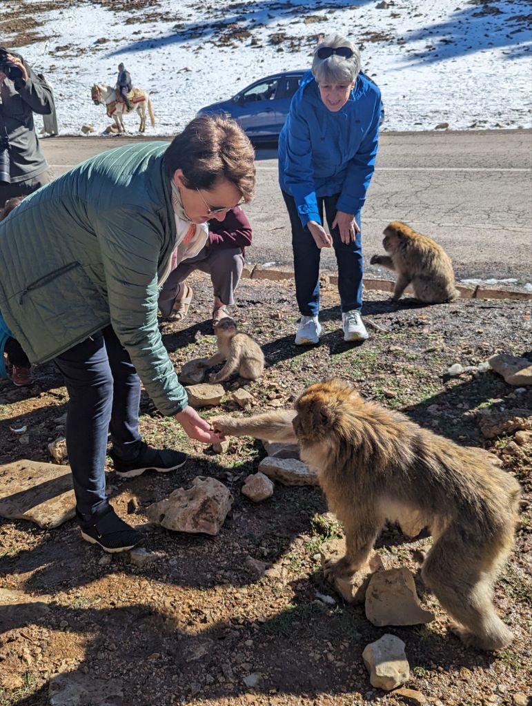 Leaving Fes on a Thursday we headed south towards Erfoud and the Sahara. A day long bus ride took us from verdant planted fields and olive groves to the pines, Atlas cedars, and snow of the Middle Atlas mountains. On the way we stopped at the village of Irfan, known as the “city of caves”, for a quick break. This college town had a Moroccan-Bavarian fusion appearance. The area is a summer vacation destination away from the heat of the lowlands. Statues of the now extinct Atlas Lions graced the town square, the air was crisp and clean, and friendly dogs roamed the quiet streets. A Swiss Harley Davidson entourage lined up their hogs near our sleek bus. We continued up the mountain pass to see the wild Barbary apes (macaques) that scrounge for handouts. A handful of peanuts for a dollar gets you the thrill of feeding them, meanwhile, Berbers on horses posed for photos. Everyone expected a tip for a photo anywhere. Further on small ski slopes appeared and short skis piled into 5 gal buckets were ready to be rented. You’d have to walk up the hill first, however. Snowmen and snow lions waved from the roadside.