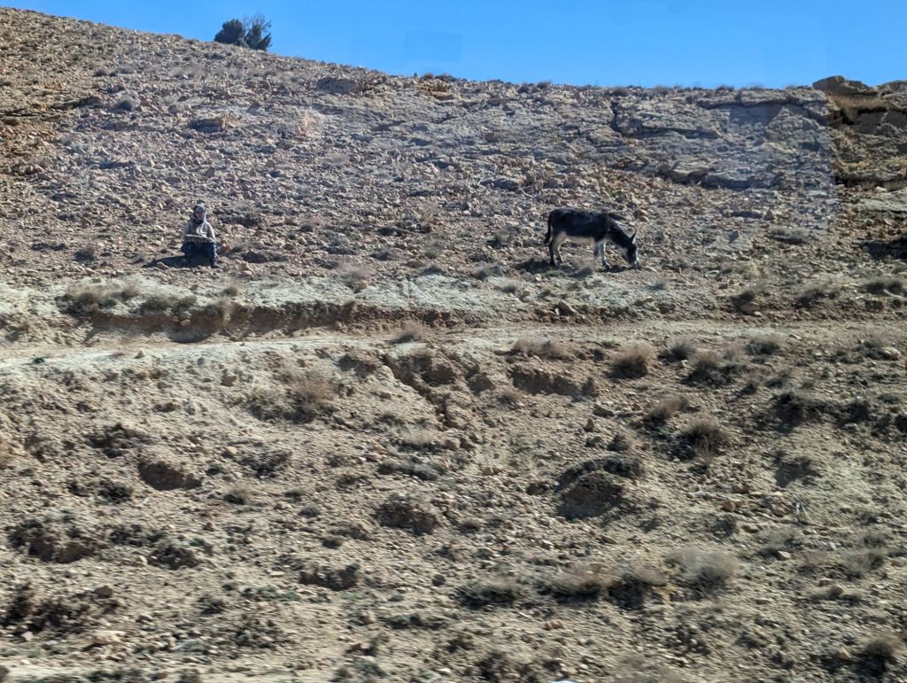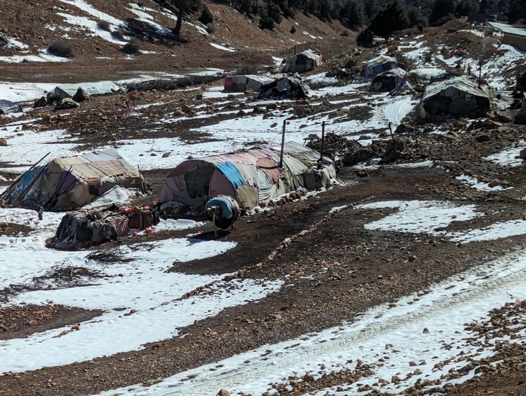 Once on the rocky high plains between the Middle and High Atlas mountains the snow petered out and Berber goatherders, goats, and their rustic accomodations appeared. Berbers, or the Agazigh, are the indigenous people in Morocco since the ancient tribes: Phoenicians, Carthaginians, and Romans died out or left. “Agazigh” means noble and free and there are 21 tribes within. Berbers are the ‘local’ nomads whereas Bedouins are Arabs from Lebanon. Berber woman wear black dress with embroidery; Bedouins wear plain black, and the Saharan Toureg women wear blue or colored dress, others tribes may wear white. It’s purely cultural, not religious.