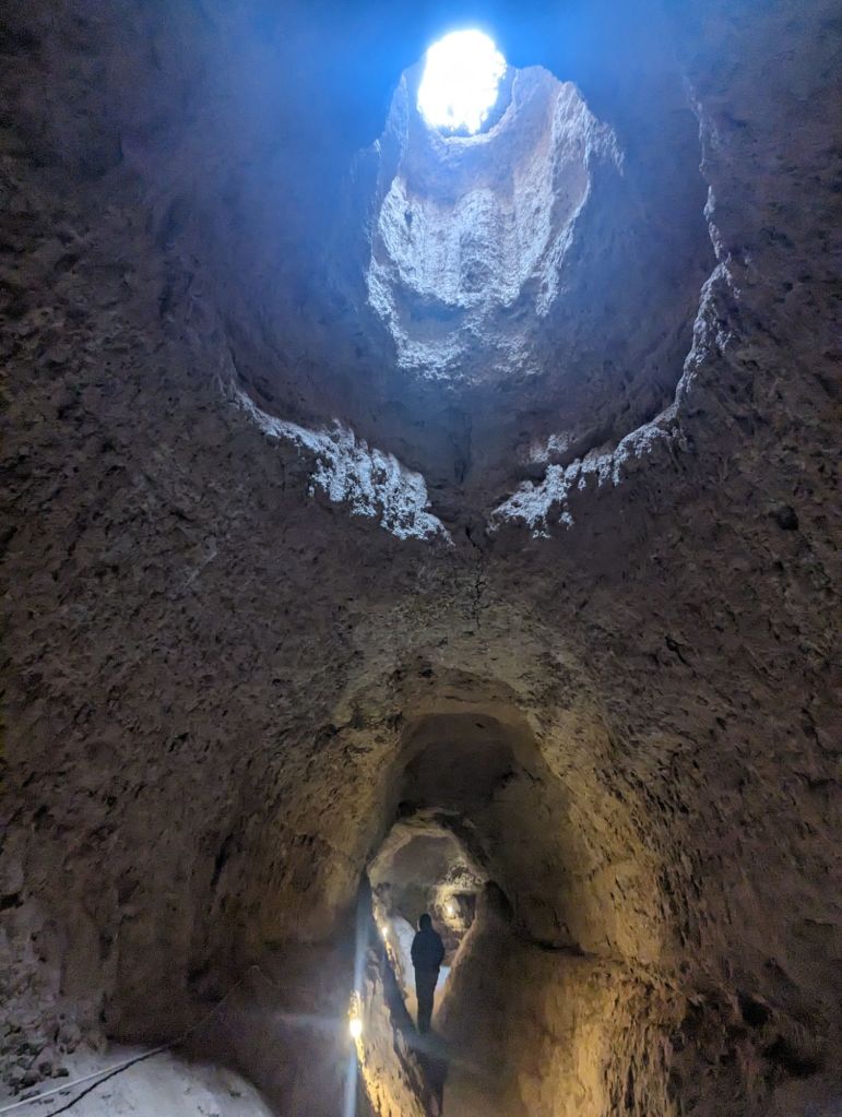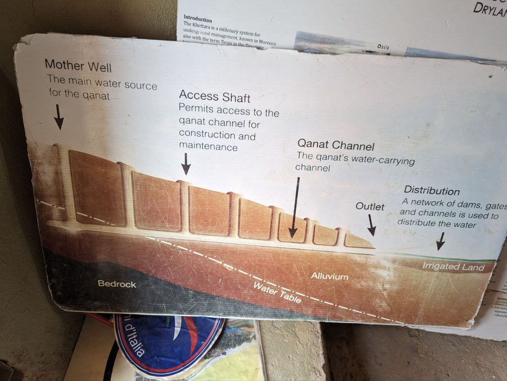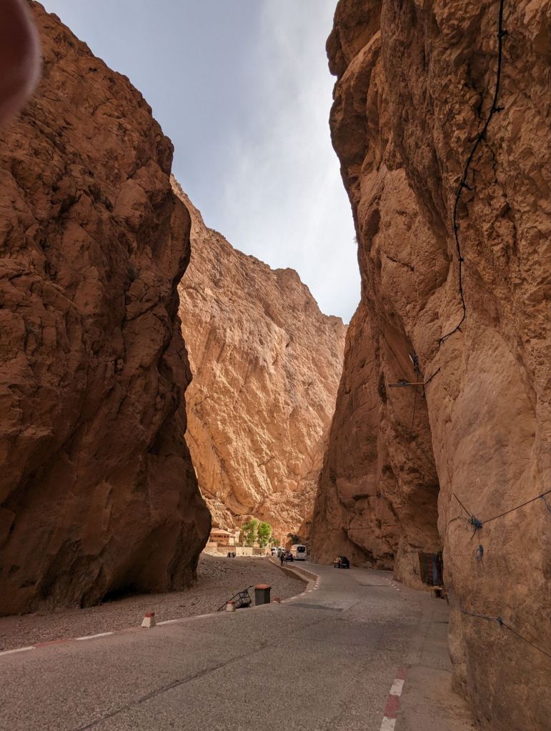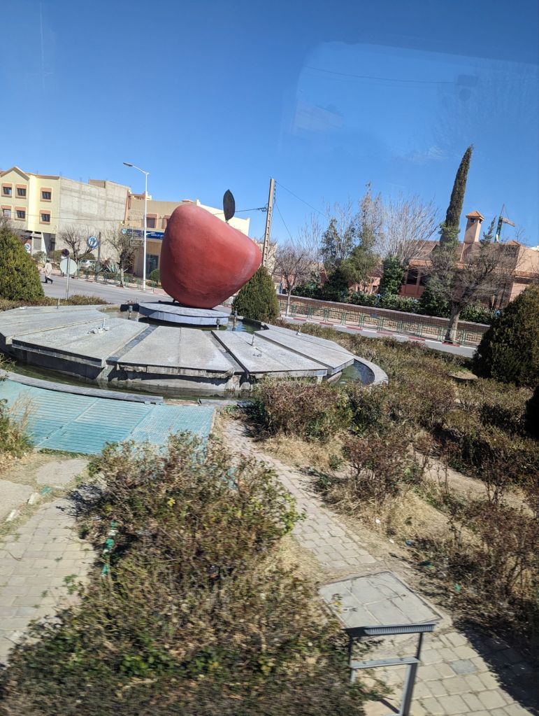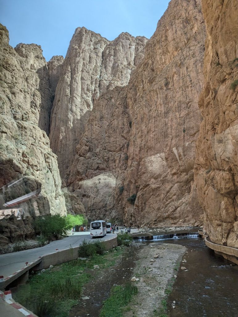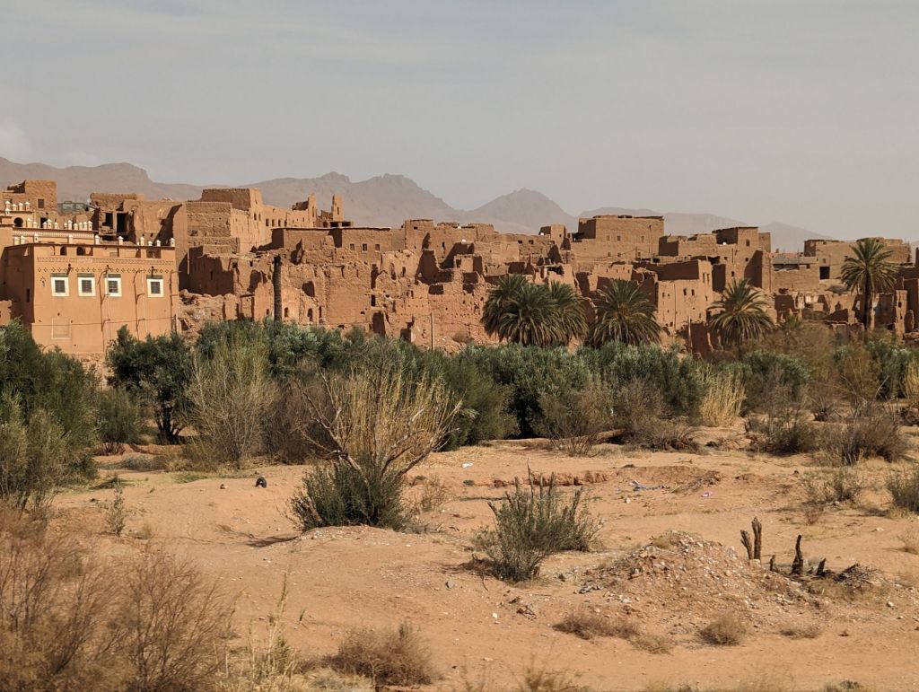 On Saturday we left Erfoud and headed to Ouarzazate. On the way we stopped to visit an underground irrigation system. Piles of sand stretched in rows for miles along the road. Each was an opening into an underground tunnel used for moving water. Families contributed to digging and maintaining the tunnels and benefitted from the results. When these ‘Khetteras’ eventually fell out of use, Moroccans would use them to evade the colonial French in the early 20th century. Irrigation systems were evident everywhere with oasis communities at the center. A little further along we were surprised to see a camel herder using a motorcycle. The motorcyclist came by for his requisite photo tip. The herd was worth about $40,000.00. We proceeded to the ‘Road of 1,000 Kasbahs’ and indeed, the name was not an exaggeration. Sandstone colored kasbahs lined the road and river valley far into the distance. Just a little beyond we visited Tinghir, a massive gorge that is a rock climber’s dream (or nightmare). A new hotel at the base of the gorge had been abandoned due to falling rocks. Goats and goatherders climbed the steep hills alongside while hawkers sold scarfs and knickknacks amid the ‘gorge-ous’ beauty. We continued on, making a technical stop at a gift/coffee shop near the Rose of Damascus, the rose growing district. Here roses are grown for their petals for making perfumes and rosewater and rose flavored items. 5500 tons of petals are collected each year. I got an ice cream.