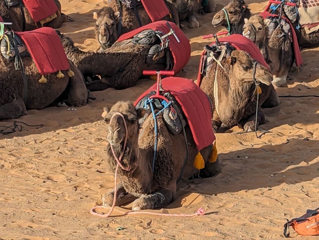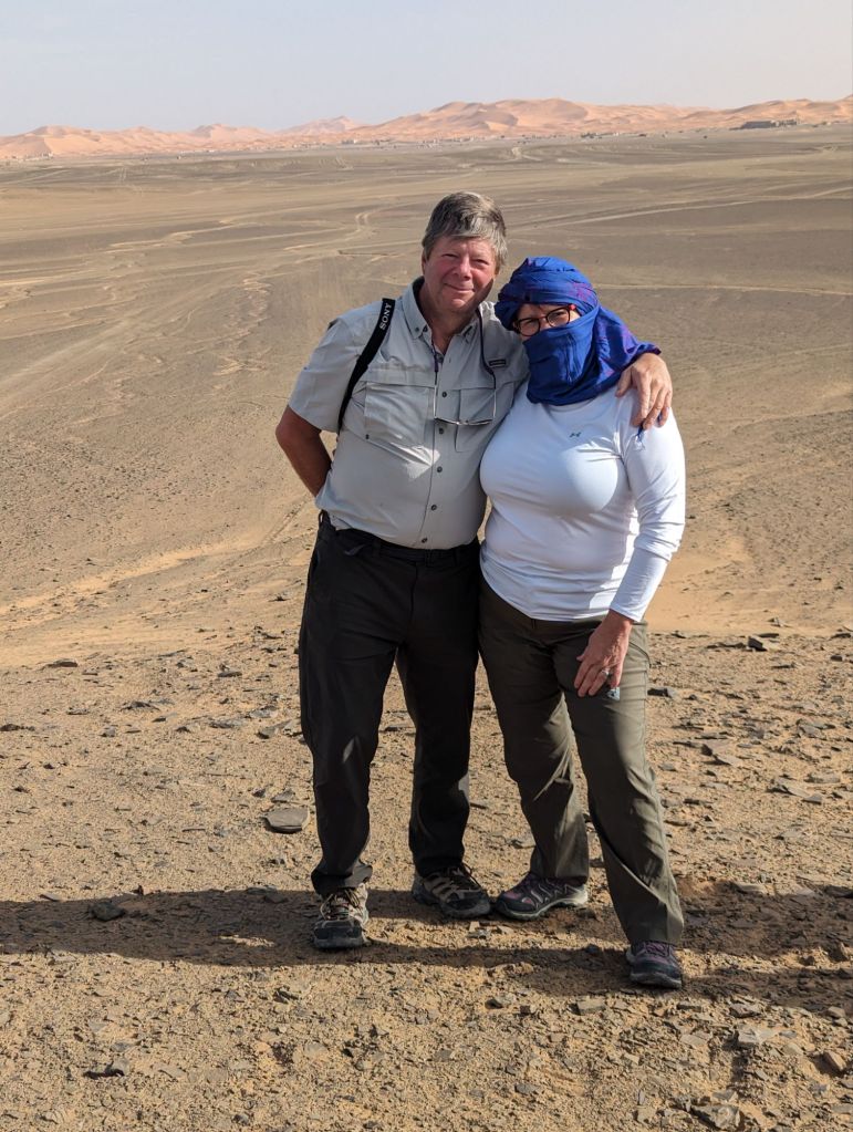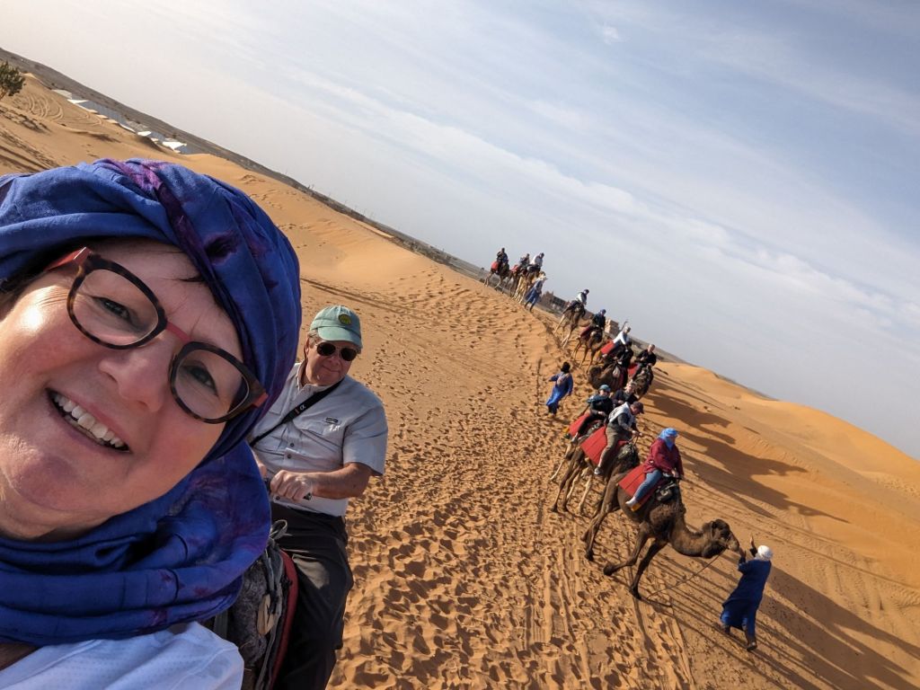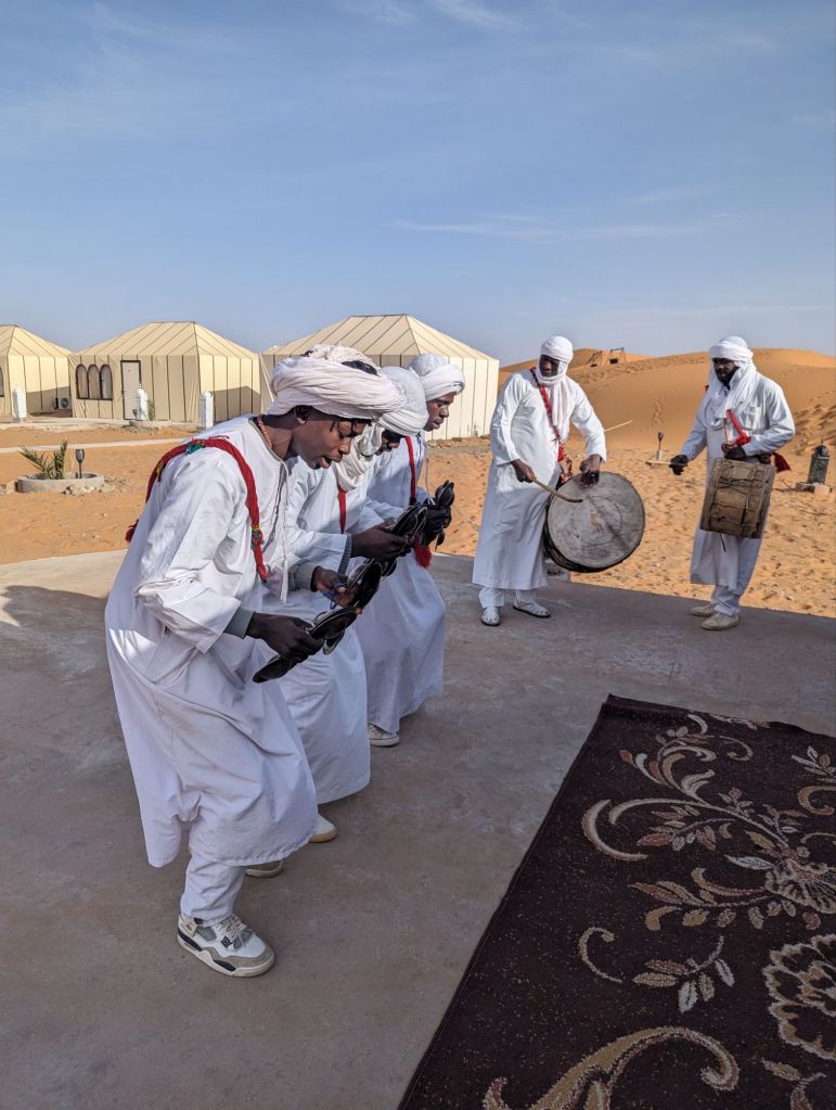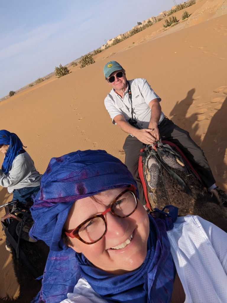 Late that afternoon we departed the hotel in 4×4 vehicles for the Sahara sand dunes. Morocco’s southern and southwestern corners occupy part of the Sahara desert. The Sahara (which translates from “desert”) extends from the Atlantic to the Red Sea, a 3,000 km goldmine of lucrative minerals including lithium and phosphate. Algeria, Morocco’s neighbor to the East, still quarrels with Morocco about the ownership of this Western Saharan parcel. Politics aside, we did a little “baha-ing” on our way to our destination: a tent encampment on the dunes. So charming! We were greeted with tea and cookies and a North African Maghrebi instrumental group playing Gnawa music using drums and qraqeb (double castanets) with a repetitive mantra-like beat. It was hard to discern one performance from another but it was easy to join in with them. Afterwards, we climbed onto dromedaries in groups of 5 and ascended the sand dunes to enjoy the sunset. We sat astride the camels wearing our colorful turbans and slowly waddled up the dunes, some more stable than others. I was in the Sahara, the stuff of 6th grade dreams and romantic black-and-white movies! It was awesome. We dismounted on a ridge facing the sunset but alas, the sun faded behind a haze of clouds. Nevertheless, our group and several other groups nearby enjoyed the company and the view and the fine grains of amber and camel colored sand. Greg sat on his ‘steed’ behind me, his camel nuzzling my leg or, more likely, wiping his snot on my pants. Gosh they’re ugly-cute. We returned to the tents for more Gnawa music, dancing, wine, tagine, and fruit under the stars.