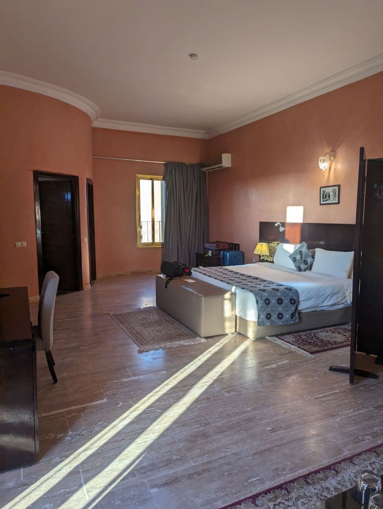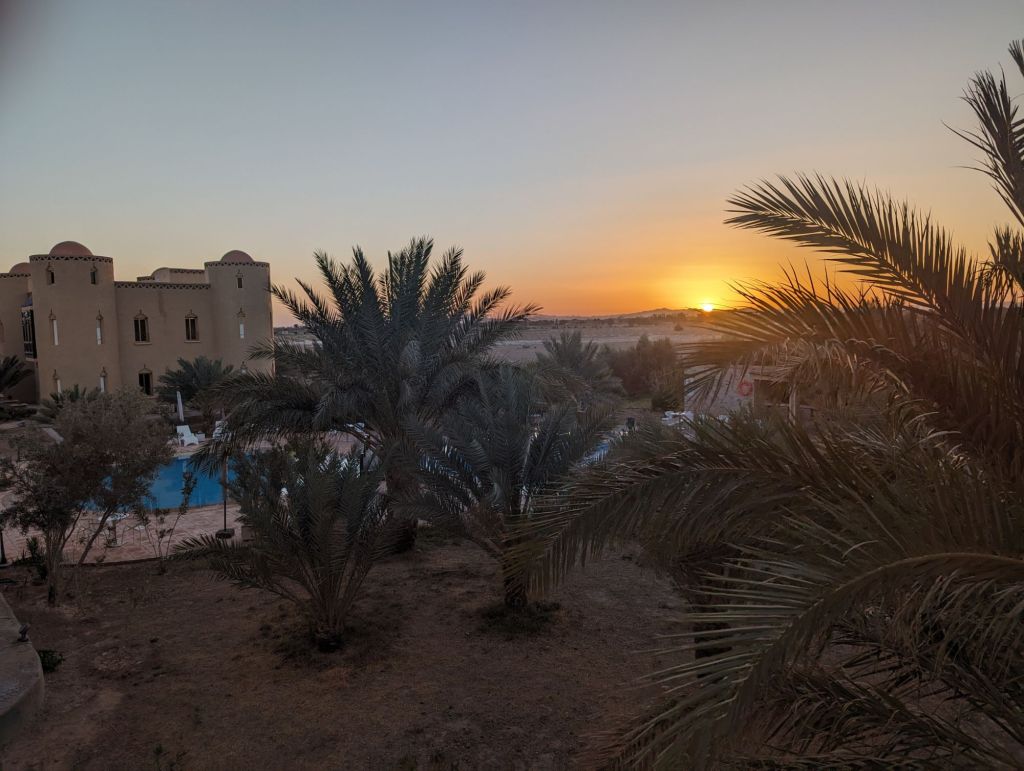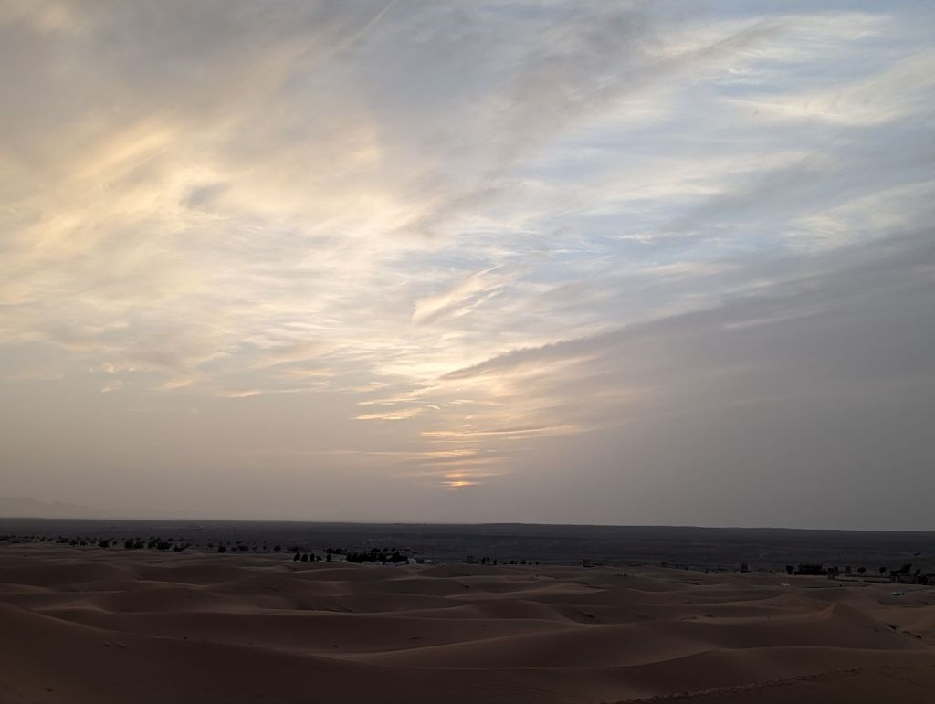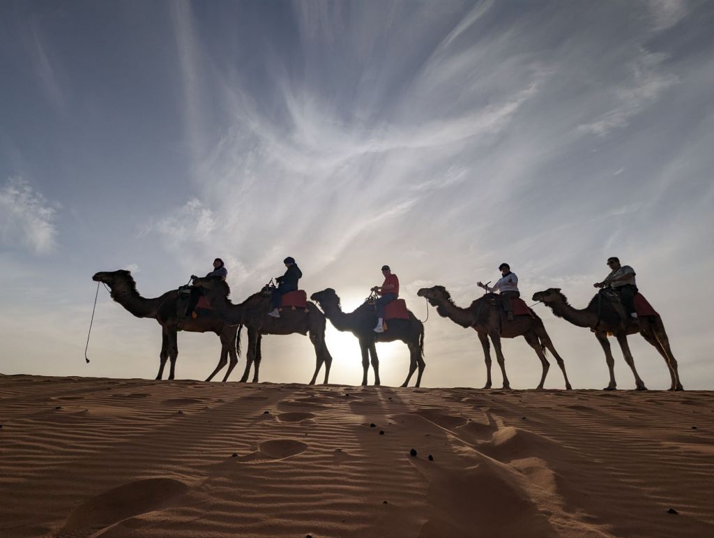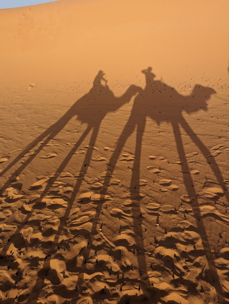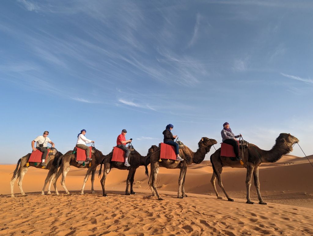 Late that afternoon we departed the hotel in 4×4 vehicles for the Sahara sand dunes. Morocco’s southern and southwestern corners occupy part of the Sahara desert. The Sahara (which translates from “desert”) extends from the Atlantic to the Red Sea, a 3,000 km goldmine of lucrative minerals including lithium and phosphate. Algeria, Morocco’s neighbor to the East, still quarrels with Morocco about the ownership of this Western Saharan parcel. Politics aside, we did a little “baha-ing” on our way to our destination: a tent encampment on the dunes. So charming! We were greeted with tea and cookies and a North African Maghrebi instrumental group playing Gnawa music using drums and qraqeb (double castanets) with a repetitive mantra-like beat. It was hard to discern one performance from another but it was easy to join in with them. Afterwards, we climbed onto dromedaries in groups of 5 and ascended the sand dunes to enjoy the sunset. We sat astride the camels wearing our colorful turbans and slowly waddled up the dunes, some more stable than others. I was in the Sahara, the stuff of 6th grade dreams and romantic black-and-white movies! It was awesome. We dismounted on a ridge facing the sunset but alas, the sun faded behind a haze of clouds. Nevertheless, our group and several other groups nearby enjoyed the company and the view and the fine grains of amber and camel colored sand. Greg sat on his ‘steed’ behind me, his camel nuzzling my leg or, more likely, wiping his snot on my pants. Gosh they’re ugly-cute. We returned to the tents for more Gnawa music, dancing, wine, tagine, and fruit under the stars.