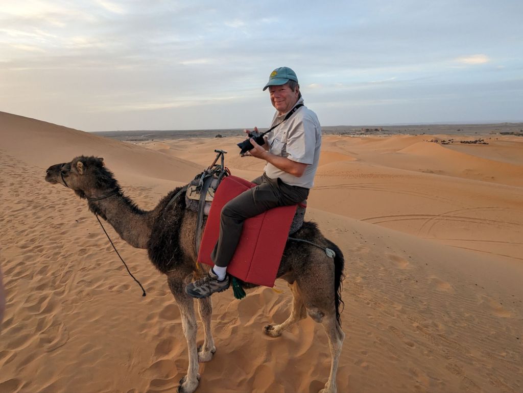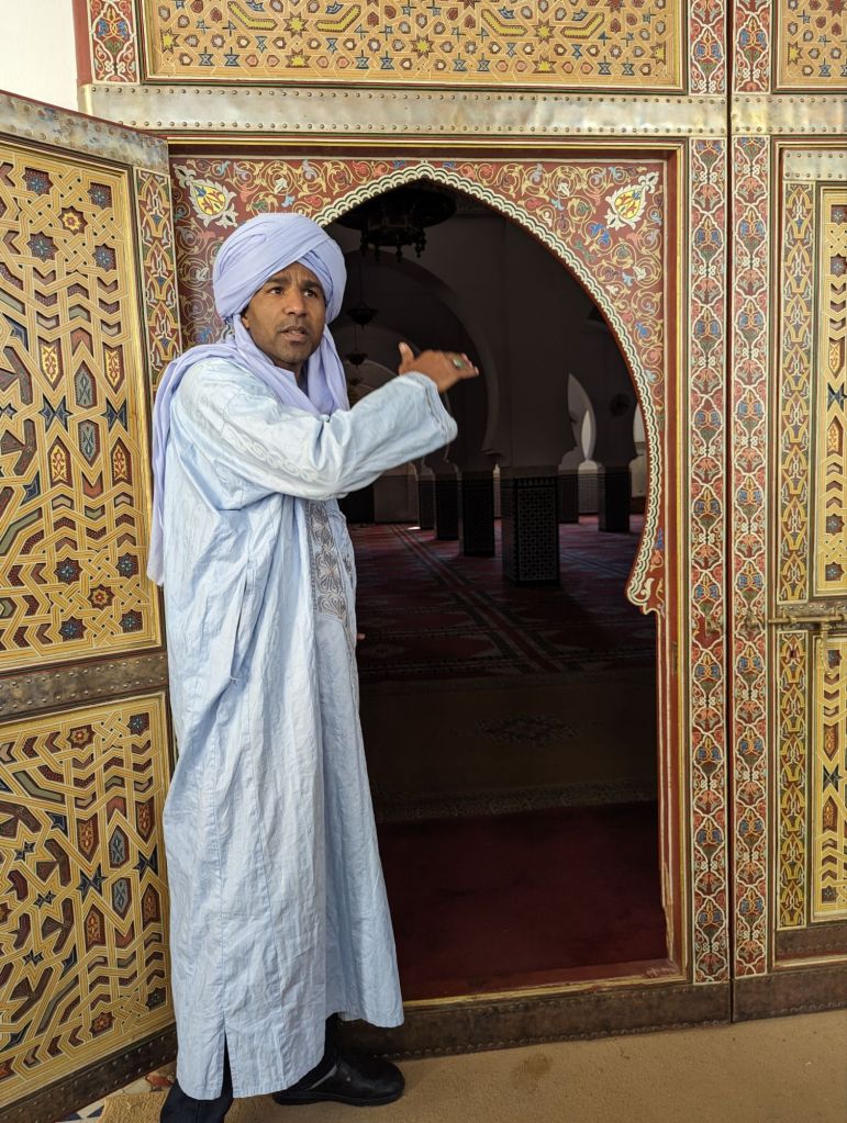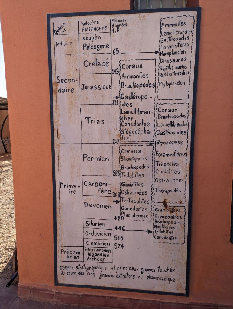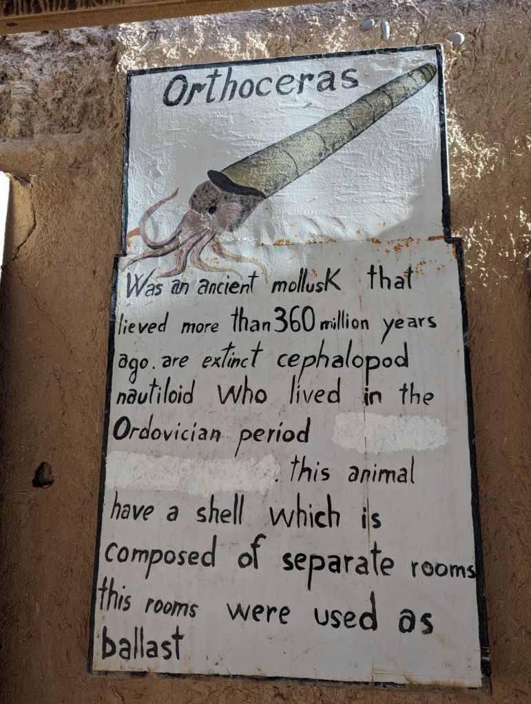 We reached our hotel, the Hotel la Palais du Desert in Erfoud that evening. Greg and I were “upgraded” to a larger room. The space was nice but the broken shower and hard mattress were disappointing. Also, when later we lounged at the frigid pool, the fibreglass chairs left an itchy rash and we were beset with annoying flies. The luxury was surface aesthetic but we managed despite. In the morning we headed out to a rock shop. The whole area is rife with fossils: ammonites, trilobites, orniates, and orthoceras. We listened to a demonstration of harvesting, polishing, and creating art pieces with the fossils. As private landowners the shop owners can sell the fossils but also welcome archeologists to study the quarry treasures. There were some really cool fossils and creations highlighting them: tables, plates, jewelry, wine racks, wall decorations. Our hotel had flooring, sinks, and tables featuring embedded fossils. After the usual shopping frenzy we visited a mosque and kasbah in Rissani for an interior look and also a special visit with a pre-school class. Idris was our guide, a Toureg in Indigo colored dress. Indigo is also used to color the skin of the locals as sunscreen. It was nearly Friday afternoon when schools and markets close but we were able to visit with 40 pre-school children and their teacher in a tiny school room. We walked through narrow alleys and ducked through tiny doorways to reach the children. We jammed our 22 adult bodies into an already overfilled basement-like room decorated with posters. They proudly and loudly sang a few songs and we likewise sang to them: Row Your Boat in the round and the English alphabet song. We sounded pretty good. They were adorable. The teacher was very appreciative of our school supplies donation. We also visited a silver and curio shop and then many of us purchased scarves for our evening event: a camel ride and dinner on the sand dunes.