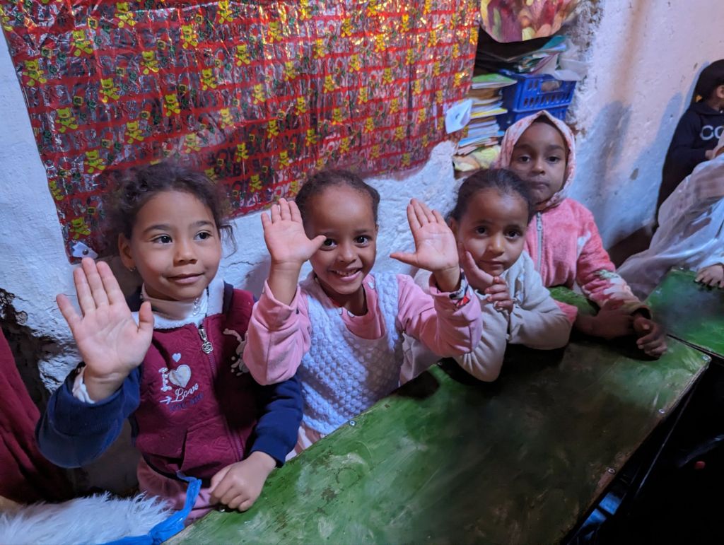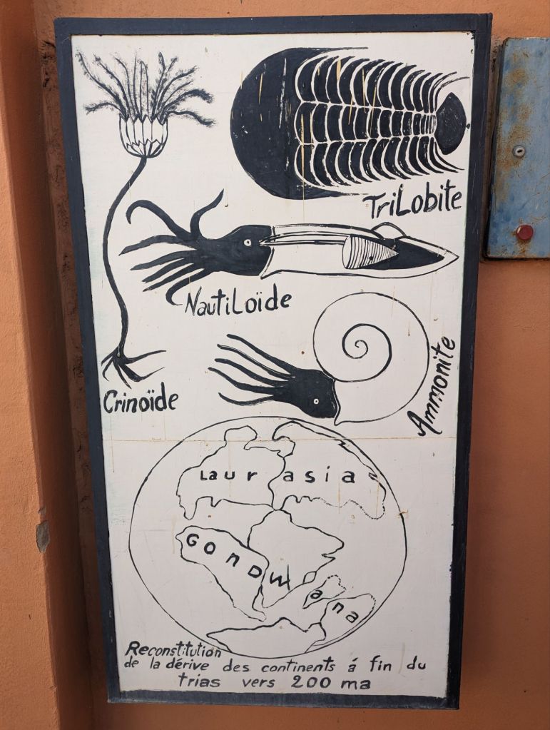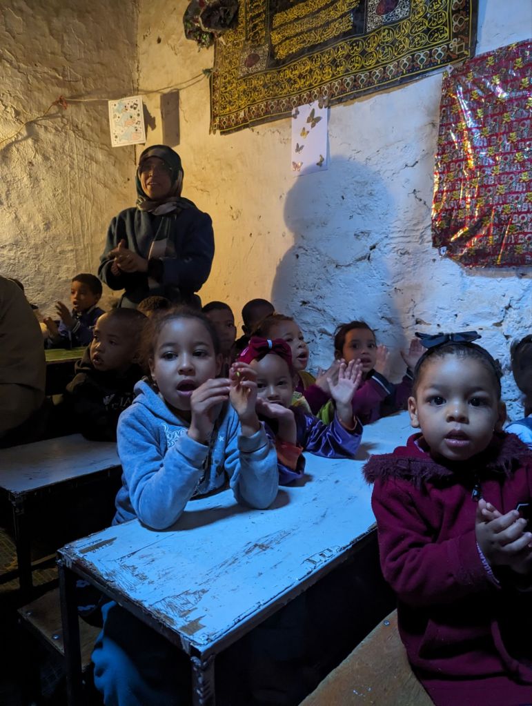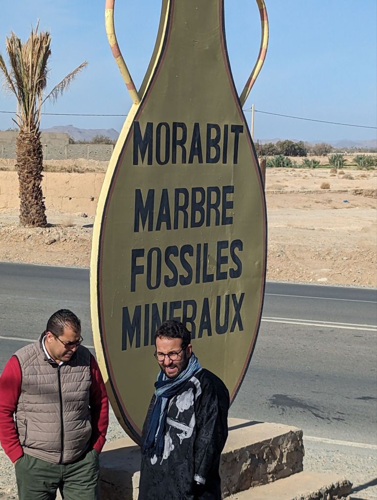 We reached our hotel, the Hotel la Palais du Desert in Erfoud that evening. Greg and I were “upgraded” to a larger room. The space was nice but the broken shower and hard mattress were disappointing. Also, when later we lounged at the frigid pool, the fibreglass chairs left an itchy rash and we were beset with annoying flies. The luxury was surface aesthetic but we managed despite. In the morning we headed out to a rock shop. The whole area is rife with fossils: ammonites, trilobites, orniates, and orthoceras. We listened to a demonstration of harvesting, polishing, and creating art pieces with the fossils. As private landowners the shop owners can sell the fossils but also welcome archeologists to study the quarry treasures. There were some really cool fossils and creations highlighting them: tables, plates, jewelry, wine racks, wall decorations. Our hotel had flooring, sinks, and tables featuring embedded fossils. After the usual shopping frenzy we visited a mosque and kasbah in Rissani for an interior look and also a special visit with a pre-school class. Idris was our guide, a Toureg in Indigo colored dress. Indigo is also used to color the skin of the locals as sunscreen. It was nearly Friday afternoon when schools and markets close but we were able to visit with 40 pre-school children and their teacher in a tiny school room. We walked through narrow alleys and ducked through tiny doorways to reach the children. We jammed our 22 adult bodies into an already overfilled basement-like room decorated with posters. They proudly and loudly sang a few songs and we likewise sang to them: Row Your Boat in the round and the English alphabet song. We sounded pretty good. They were adorable. The teacher was very appreciative of our school supplies donation. We also visited a silver and curio shop and then many of us purchased scarves for our evening event: a camel ride and dinner on the sand dunes.