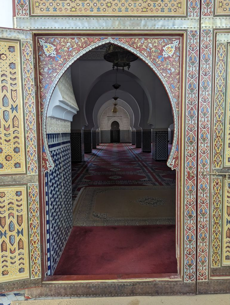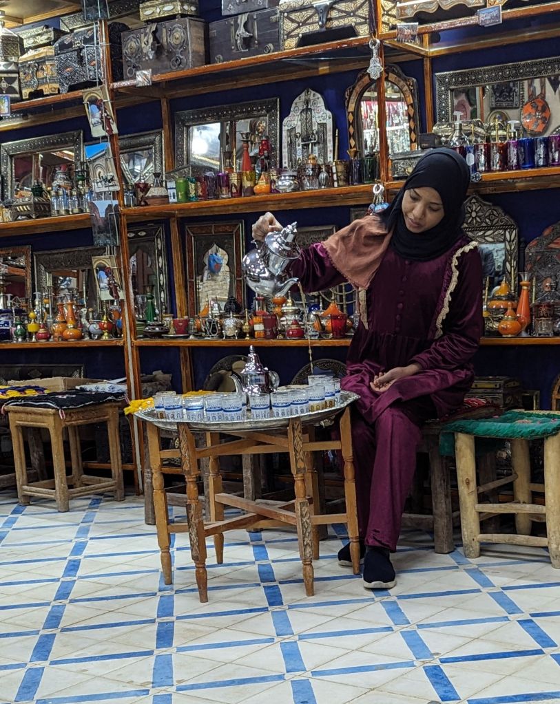 We enjoyed another abundant lunch at a roadside restaurant in Metrouni before crossing the mountains. For lunch: a calzone-like dish stuffed with either Moroccan spiced veggies or beef. And the ubiquitous tea. Some tea is better than others; the best is accompanied by cookies but otherwise it can seem too bitter so I started asking for sugar so I could politely finish my drink. Ironically, when tea was introduced by the British travellers from the Silk Road and India in the 16th century it was forbidden by Koranic scholars as mind-altering. It was traded for sugar then. Now it is the national drink, often jokingly called “Moroccan whiskey”.