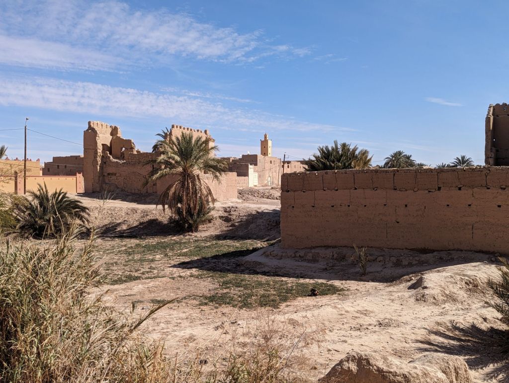 We followed the road onward toward the mountains along the gold trade route with old and new kasbahs alongside. I’ve lost track of the number of 9th, 10th, 11th, 12th century dwellings and fortresses and mosques we’ve seen. The history here is mind boggling as when describing 28 generations of a sultan King’s heritage or Berbers living as nomads even today.