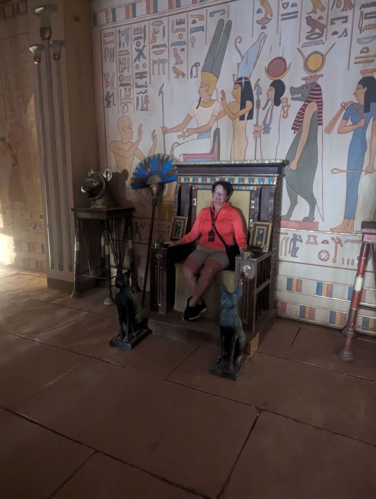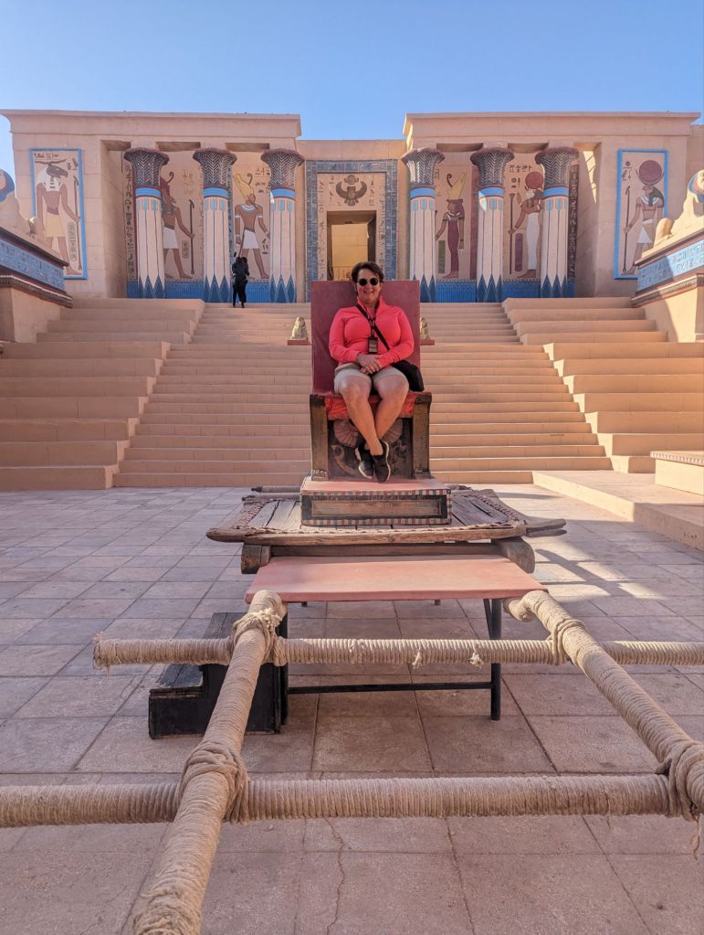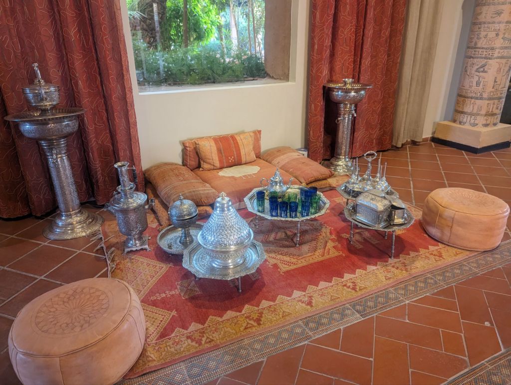 More kasbahs, goats, oases, and women washing laundry in streams followed until we arrived in Ourzazate in the late afternoon. We stayed at the Hotel Berbere, an expansive, maze-like, beautiful hotel favored by celebrities. The lobby was filled with movie props since Atlas Studios is nearby. Here they filmed “the Jewel of the Nile” and then donated the studio to the municipality. Since then “Prince of Persia”, “Aladdin”, and other movies were filmed here. It was interesting to see the studio lots prepped as Cleopatra’s throne or a desert village or a Chinese temple made of thin adobe with nothing but scaffolding behind and perspective skewed for filming.
