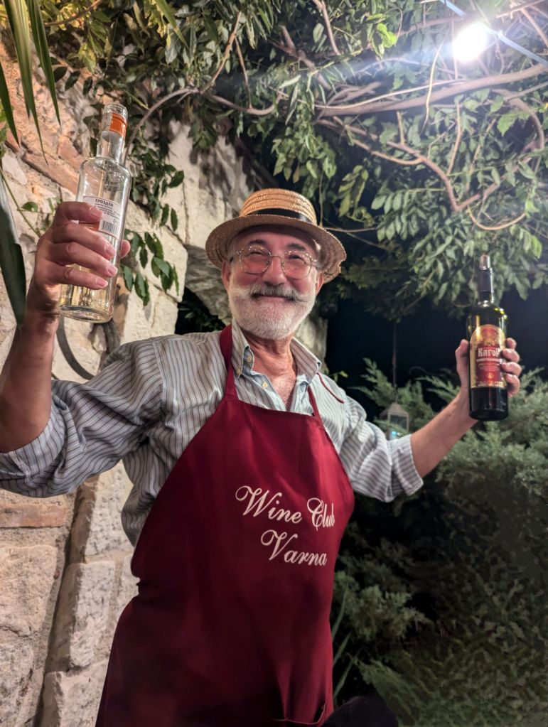 Back on the bus we traveled almost 2 hours over the Balkan mountains to Varna. Varna is another Black Sea coastal city, the largest Bulgarian port and also a seaside resort. Shortly after arrival we headed to dinner at a wine club in the city’s outskirts. The charismatic homeowner, Dima, presented a wine tasting dinner in a Tuscan/Bulgarian fusion villa. We dined under wisteria vines on healthy garden fare and grilled meats: chicken, veal, sausage, seasoned with Bulgarian spices and accompanied by wines: white, rose, and red, all fermented from a single type of grape-the Mavrud grape. I enjoyed the dry white and the red. More Rakia was served (and poured out) but the antics of the host made for a memorable evening.