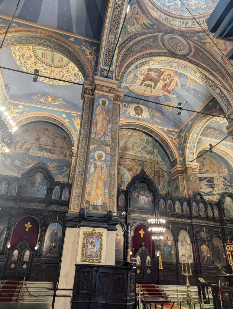 Our full day in Varna we spent touring and wandering, as usual. First we had a tour of a few significant monuments in a park, notably a monument expressing gratitude from the Jewish community to the Bulgarian people for refusing to send anyone to the concentration camps. King Boris III and the Bulgarian population in general intervened. King Boris was shortly thereafter poisoned but the culprit nation has never been identified. (You may recall he was buried in the Rila Monastery church, then his body was stolen.) We visited the Archeological Museum with its remarkable exhibits of Bulgarian human occupation from 5 millennia BC to more recent times. The highlight was the gold jewelry and burial gifts from a gravesite of 4500BC. The craftmanship of jewelry, pottery, and weapons from millenia before Christ was something to see. We then had a short visit to the St. Sofia Cathedral with its shiny gold domes but only briefly since a funeral was to be held within minutes of our arrival. That would’ve been a little too much cultural immersion.