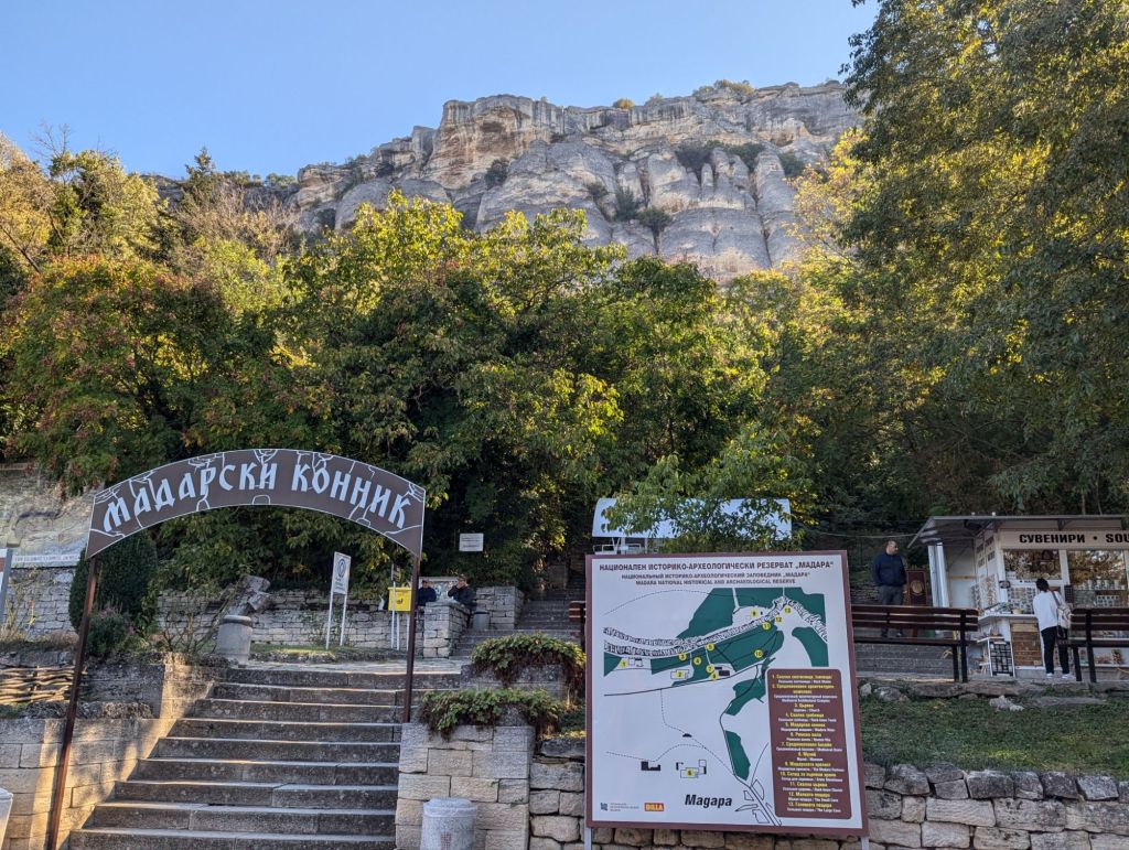 Our last day in Bulgaria we headed northwest to the Danube to the border crossing to Romania, a bus ride of several hours. On the way we stopped at 2 interesting sites: the Madara Horseman and the Thracian Royal Tombs. The Madara Horseman is a bas relief carved into the limestone cliffs around Madara. The scene depicts a horseman spearing a lion accompanied by a dog. The carving dates to 700-800AD to honor Bulgurs (the horseman) who defended the area from Arab invasion (the lion). The carving has some inscriptions which enable dating. There are around 200 steps up to the viewing area and the carving is more than a few meters higher up on the cliff. After further driving we stopped at the Thracian Royal tombs.