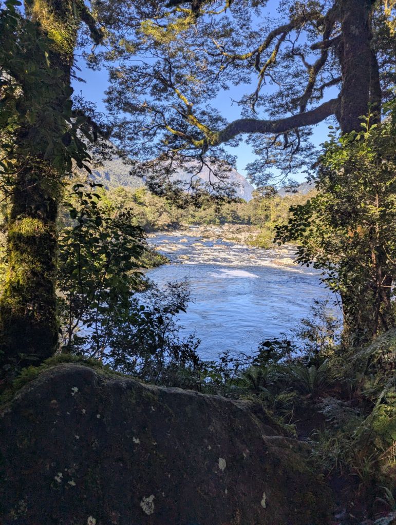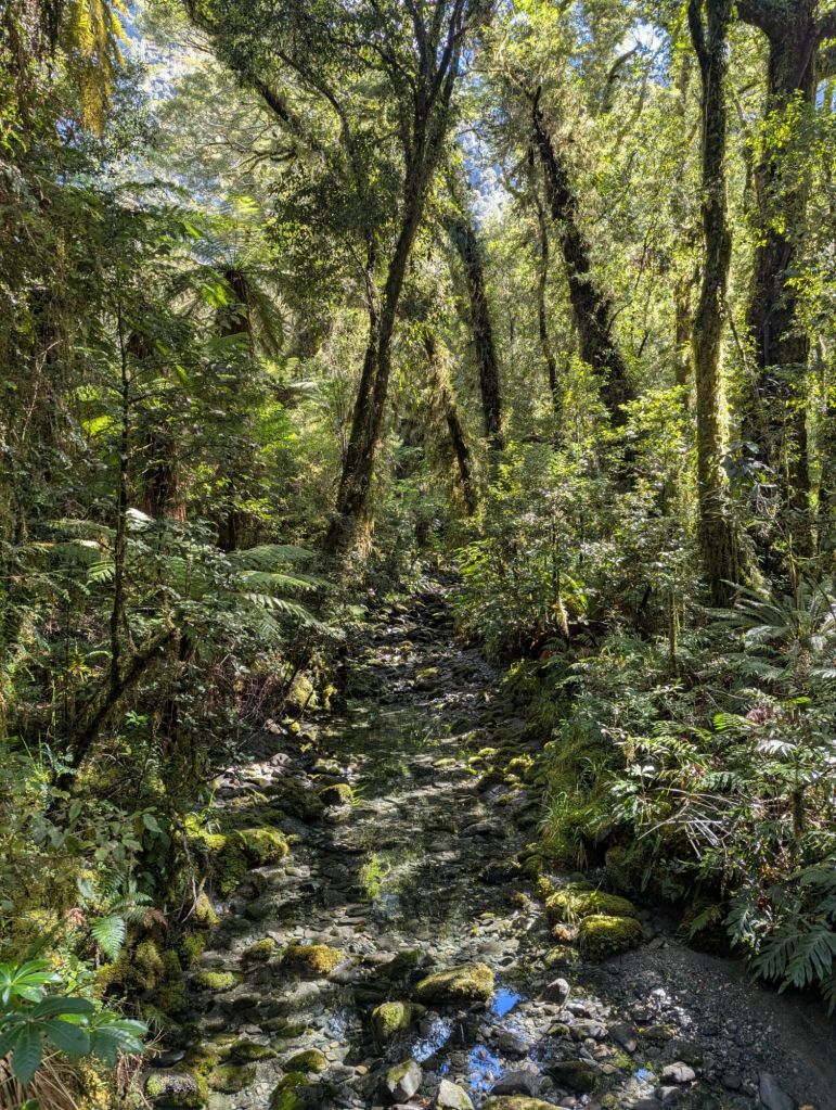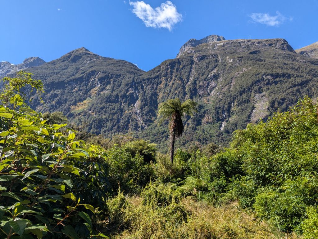 Day 2: Despite a rainy forecast the day turned out beautifully. Morning fog settled on the lakes in the Mystic Mountains as we approached Milford Sound. Scenes from Lord of the Rings were filmed in this area and Isildur was located nearby. We looked for elves and hobbits along the road. The sheer walls of the schist mountains began to enclose the roads as we approached the one-way tunnel. This section of road is avalanche country, the highest maintenance costing road in the country. Exiting the tunnel the valley opened up and we arrived at our destination at the entrance to the famous Milford Sound. First, a hike along the Arthur River in the temperate rainforest. We disembarked our ferry shuttle at Sandflea Harbor, an eponymous name as sandfleas greeted any non-moving human. Also ‘harbor’ is a very generous term; it’s more just a landing spot. The track here was more rocky and possibly ankle busting. I opted to walk partway to Lake Ada and meandered back enjoying the scenery, mossy trees, waterfalls, ferns, and large leafed philodendrons along the way. The guides offered tea and we enjoyed our lunches while the faster, more intrepid hikers made it to the waterfall and back for the full 7 miles (Greg). The entire through-track is 33 miles long but we enjoyed the little bit we saw. By this time our little group was enjoying jokes, stories, and getting to know each other. We then took a tourist cruise of Milford Sound out to the Tasman Sea. Our boat skimmed along the sheer cliffs of schist in and around the fjords with cascading waterfalls all around. The water depth reaches 1000 ft beneath. The Sound was formed by ancient glacial retreat from the Tasman Sea inland. The remaining Harrison’s Cove Glacier is expected to disappear within 25 years. This day remained sunny with clouds and the experience was memorable.