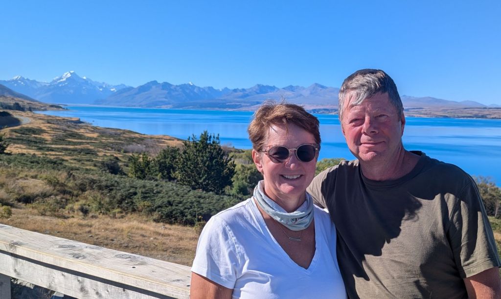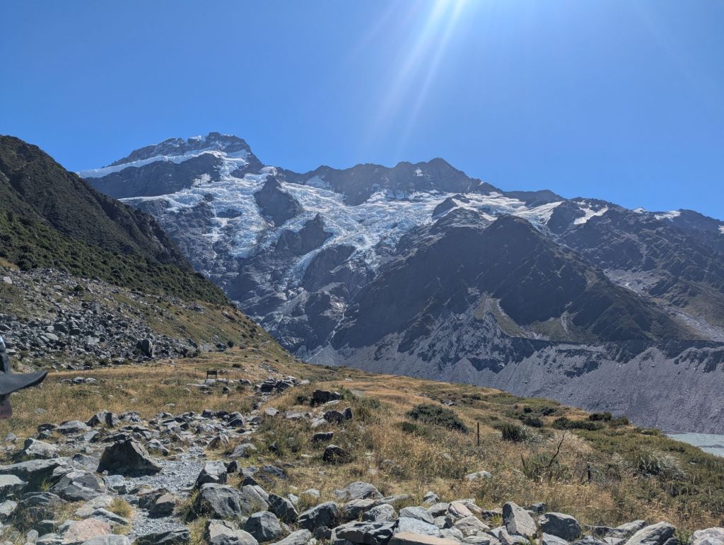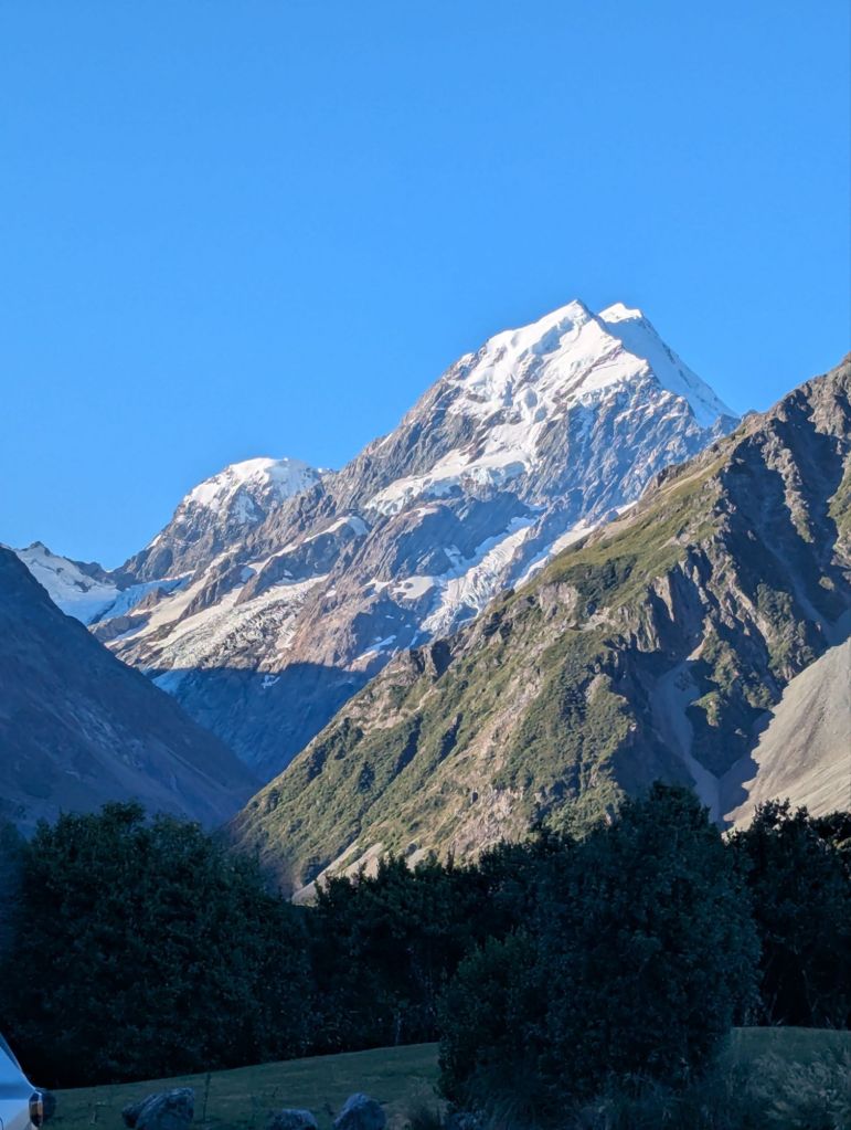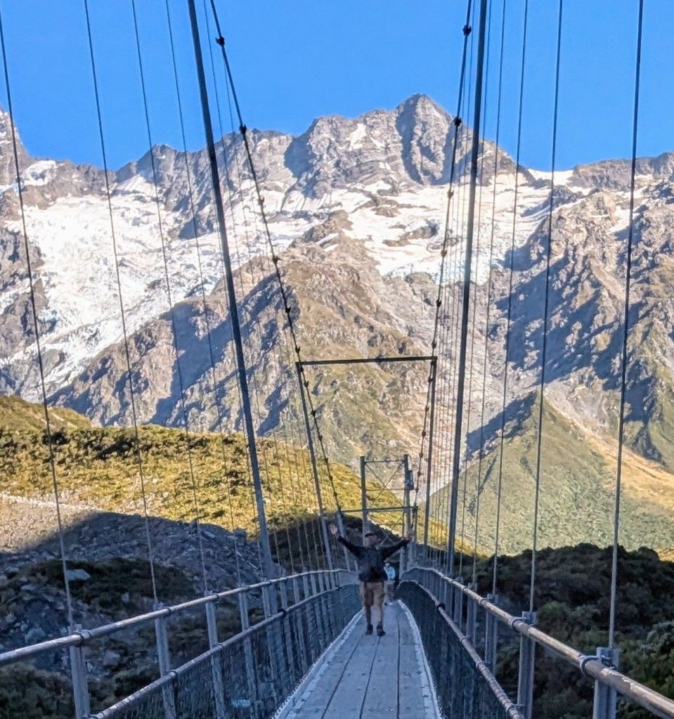 Day 4: We got an early start the next cloudless morning on the Hooker Valley Trail which trailhead started quite near our hotel. This meandering trail took us along the glacially fed river to Hooker Glacier Lake with Mt. Cook just ahead. The sun rose over the mountain ridges and changed the dark blue lake to the cloudy teal of a typical glacial lake. We hiked back for lunch. Afterwards, Greg hiked the Red Tarns trail up the side of a nearby ridge while I hiked the “flatter” Kea Point Trail to a glacier field viewpoint, accompanying new friends Erika and Drew. We listened for cracking and avalanches in the distant blue glacial ice. Our hotel had excellent buffets but also a small museum dedicated to Sir Hillary, a NZ native. We watched an autobiographical movie in the small but nice theater and also a planetarium show after dinner. This area is a UNESCO dark sky location where the Milky Way is quite evident. The planetarium show was ‘moderate’ tech but the narration was informative. Reminder: we really are insignificant in the grand scheme; billions of galaxies! Exhausted after 10 miles of hiking, sleep was quite welcome.